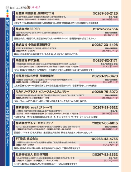 ☎0267-56-2125担当/佐藤詳しくは58ページ月産業有限会社長野野方工場R142「茂田井」の信号を東御市方面に向かい車で2分程度です。①月給22万円〜40万円②③月給22万円〜35万円立科町ねっ!ココどう?☎0267-77-7554担当/採用担当詳しくは5ページ株式会社KEEPER佐久・軽井沢を中心としたエリアで、基本的に直行直帰です。時給1,100円〜佐久市雰囲気の良い職場です。未経験の方でもしっかりサポート!面倒見が良い会社ですよ〜♪☎0267-23-4498担当/採用担当詳しくは49ページ☎0267-82-3171担当/採用担当・井出詳しくは31ページ壊れた自動車ガラスの交換やフィルムを貼ったりする仕事が中心です。嶋屋種苗株式会社中部横断道佐久臼田I.Cから車で10分。佐久平総合技術高等学校臼田キャンパス前!①月給20万円〜22万円②月給18万円〜20万円③月給21万円〜23万円※下記詳細佐久市株式会社小池自動車硝子店和田工業流通団地近く、和田北」信号からスグです!月給20万円〜35万円東信エリア<<正社員>>営業スタッフ募集中!佐久地方を中心に農業を支えていくお仕事です!☎0263-39-3470担当/採用担当詳しくは31ページ中部互光株式会社長野営業所小諸駅から徒歩10分。こもろ医療センターや小諸市役所が勤務先です!時給1,065円〜※深夜時給1,465円〜小諸市こもろ医療センター・小諸市役所などの設備監視のお仕事です!学歴不問・シニアの方歓迎!☎0268-75-8072担当/採用担当詳しくは38ページグループホームにて、障がい者6〜7名への朝食または夕食をつくるお仕事です。リカバリーアシストグループホームリカバリーR18東御市「田中」信号を田中駅方面に進み、田中駅前」信号を右折して100mほど進んだ左側、コーポ泉102時給1,061円※土日祝日:時給1,111円東御市ボビンとドラム製造販売の会社で、技術要員・法人営業・品質保証スタッフの3職種で正社員募集!☎0267-31-5622担当/泉詳しくは38ページ小諸駅から車で10分程度、飯綱山公園内でのお仕事です!【正】月給19万円〜(経験者応相談)【ア】時給1,100円〜1,500円※下記詳細株式会社Greve.tグレーベ)小諸市☎0267-66-6015担当/採用担当詳しくは69ページ株式会社セイバーセキュリティローソン佐久横和店様カドの「横和」信号を佐久市街地から右折して車で1分です!①月給213,280円〜258,000円②日給9,920円〜12,000円佐久市正社員・パート各10名大募集!未経験者大歓迎!研修も充実しているので安心です!小諸の景色が一望できる話題の複合施設で、ホール・キッチンスタッフ・ワイナリーショップスタッフ募集!☎0268-43-4755担当/土屋詳しくは72ページ☎0267-82-2332担当/仲沢詳しくは6ページ休日と仕事のメリハリもあり、未経験の方でも安心して働ける環境です!FT物流株式会社大屋駅から丸子に向かい「石井」信号を左折後、坂井」信号を右折し5分程度。月給21万円〜30万円上田市社会福祉法人臼田保育園ツルヤ臼田店様から車で1分、あさま薬局様の信号手前を左折してすぐです!①月給18.2万円〜②③時給1,071円〜1,176円佐久市4月から働ける正社員さんや、すぐに働けるパートさんを募集中です♪17●●●便利に探せるインデックス求人!気になる求人を見つけて各ページに!希望の職場がきっと見つかるよ!
