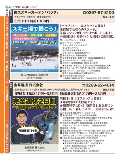 ☎0267-67-8100担当/土屋佐久スキーガーデン「パラダ」佐久平クリーンセンター様すぐ隣です!①②③④⑤時給1,100円〜佐久市ねっ!ココどう?スキー場で働こう!フードコートリフト監視レンタルチケットカウンターキッズランド未経験歓迎♪短期OK♪友達同士OK♪https://www.saku-parada.jp/佐久平尾山開発株式会社佐久市下平尾2681「パラダ」スキー場スタッフ大募集!未経験でも安心のスタート♪先輩スタッフがしっかりサポートします!未経験歓迎♪短期OK♪友達同士の応募OK♪パート・アルバイト(大募集!)①フードコートスタッフ②チケットカウンタースタッフ③レンタルスタッフ④リフト監視業務スタッフ⑤キッズランド監視業務スタッフ未経験者歓迎、経験者優遇!交通費規定支給、食事、リフトなど従業員割引あり8:00〜17:00※シフト制、応相談週休2日※出勤日時はご相談に応じます!★年末年始、土日のみ、平日のみなどの短期勤務もOK★佐久スキーガーデン「パラダ」(佐久市上平尾2066-1)学生・Wワーク・主婦(夫)・シニアも大歓迎降雪の少ない地域なので通勤も安心!①②③④⑤時給1,100円〜<月収例>時給1,100円・1日8時間勤務:月収18万円以上東部湯の丸インター近く!浅間サンライン「中央公園入口」信号からスグです!【経験者】月給24万円〜33万円【未経験者】月給21万円〜28万円完全週休2日制ラジオを聴きながらお仕事できます♪溶接工・仕上げスタッフ大募集!★年齢問わず大歓迎です♪★職場見学もOK!質問等もお気軽に♪心機一転!新しいスタート切りませんか!☎0268-62-4614担当/石田金井溶接株式会社東御市21●●●<今のまま>より<これから!>を!今よりもーーーっと!転職応援特集溶接及び仕上げスタッフ(正社員)4名半自動溶接・グラインダー作業の経験者※同業種で働いていた方や溶接経験者等でも大歓迎です♪※未経験の方も募集中です!ご相談下さい♪昇給あり、賞与あり、社会保険完備、交通費規定支給制服貸与(ゴーグル・マスクあり)、退職金制度あり8:00〜17:10完全週休2日制(会社カレンダーあり)※他、GW・お盆・年末年始まずは「ココどう?を見ました」とお気軽にお電話ください。※HPのエントリーフォームからのご応募もOKです♪【経験者】月給240,000円〜330,000円★能力により月給300,000円スタート可能です!★繁忙期は残業をお願いすることがありますが月給は「300,000円以上」可能です!★稼げて安心安定のお仕事です♪【未経験者】月給210,000円〜280,000円年間休日114日https://canaiweldingkk.com金井溶接株式会社東御市鞍掛25-22希望の仕事がきっとみつかる