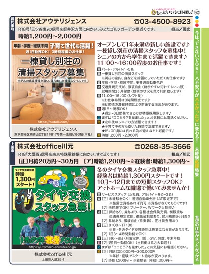 42●●●今は、できないでOK!<不安>が<よかった>に変わる!未経験応援特集希望の仕事がきっとみつかる☎03-4500-8923担当/國光R18号「三ツ谷東」の信号を軽井沢方面に向かい、みよたゴルフガーデン様近くです。時給1,200円〜2,000円年齢・学歴・経験不問子育て世代も活躍!週1日勤務OK!3時間程度のお仕事!一棟貸し別荘の清掃スタッフ募集ホテルの客室清掃と違い、落ち着いた清掃スタイルですhttps://outelli.com/株式会社アウテリジェンス東京都港区南青山2丁目11番17号第一法規ビル3階(本社)オープンして1年未満の新しい施設です♪一棟貸し別荘の清掃スタッフを募集中!シニアの方から学生まで活躍できます♪11:00〜16:00程度のお仕事です!パート・アルバイト5名一棟貸し別荘の清掃スタッフ※別荘の室内、庭などを綺麗にしていただくお仕事です♪年齢・学歴・経験不問、要普通自動車免許交通費規定支給、服装自由(動きやすい汚れてもいい服)試用期間3ヶ月程度(勤務の状況を見て判断致します)11:00〜16:00(シフト制)※お仕事時間は3時間程度です♪※お客様の滞在時間により前後する場合があります。週1日〜勤務OK!★週2〜3日勤務できる方は積極採用致します♪まずは「ココどう?を見ました」とお気軽にお電話ください。★定年後のシニアの方活躍できます!★子育て中の方も空いた時間で活躍できます♪★15:00頃には終わる為お迎えなども可能です♪時給1,200円〜2,000円株式会社アウテリジェンス御代田町R18「大屋西」信号を東京特殊電線様に向かい、すぐ近くです!担当/川元[正]月給20万円〜30万円[ア]時給1,200円〜※経験者:時給1,300円〜タイヤ交換経験者時給1,300円スタート!タイヤ交換スタッフ急募!https://utamaro-shinshu.co.jp/株式会社office川元上田市大屋25-1冬のタイヤ交換スタッフ急募中!経験者は時給1,300円スタートです!10月〜12月までの短期スタッフOK♪アットホームな職場で働いてみませんか!サービススタッフ(正社員、アルバイト各2〜3名)[正]未経験者OK!普通自動車免許(AT限定不可)※整備士資格あれば尚可※資格がなくてもOKです![ア]未経験でOK!フリーター、Wワーク大歓迎♪[正]昇給あり、賞与あり、各種社会保険完備、制服貸与交通費規定支給、退職金制度あり、試用期間6ヶ月あり[ア]昇給あり、服装自由(作業着)、正社員登用あり[正]9:00〜17:30※春・冬のタイヤ交換時期は残業になる事があります。[ア]1日3〜4時間勤務でOK![正]月6〜8日(月曜定休、他)、GW、お盆、年末年始[ア]週1日〜勤務OK!(土日働ける方大歓迎!)まずは「ココどう?を見ました」とお気軽にお電話ください。[正]月給200,000円〜300,000円※年齢・経験でスタート給与が変わります。[ア]時給1,200円〜※経験者:時給1,300円〜☎0268-35-3666株式会社office川元上田市