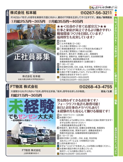 44●●●今は、できないでOK!<不安>が<よかった>に変わる!未経験応援特集株式会社松本組☎0267-56-3211R142沿い「和子」の信号を東御市方面に向かい、最初のT字路を左折してすぐ左手です。担当/採用担当①月給25万円〜30万円②月給35万円〜40万円★★<社員の子育て応援宣言>★★仕事と家庭が両立できるより働きやすい職場環境づくりを目指しています♪福利厚生も充実しています♪正社員①土木作業員(2〜3名)②土木施工管理技士(2〜3名)①普通自動車免許※キャリア形成の為40歳以下②土木施工管理技士(1級または2級)昇給あり、賞与あり(実績による)、制服貸与家族手当、皆勤手当、各種手当あり、社会保険完備有給休暇あり、建設業退職金共済各種資格取得支援制度あり(全額支援!)7:00〜17:00完全週休2日制、GW、お盆、年末年始、年間休日120日まずは「ココどう?を見ました」とお気軽にお電話ください。社員の子育て応援をしており、子どもに関する行事など積極的な参加をすすめています!①月給250,000円〜300,000円②月給350,000円〜400,000円正社員募集https://matsumoto-gumi.com/株式会社松本組北佐久郡立科町大字田2820-1FT物流株式会社大屋駅から丸子に向かい「石井」信号を左折後、坂井」信号を右折し5分程度。月給21万円〜30万円立科町上田市☎0268-43-4755担当/土屋希望の仕事がきっとみつかる4t・10tドライバー(正社員)未経験でOK!仕事内容により必要なスキル・資格は入社後に取得できます!まずはお問い合わせください!※普通自動車免許は必要です。昇給あり、賞与年2回、各種社会保険完備、制服貸与交通費規定支給、家族手当あり、退職金制度あり残業代別途支給、各種資格取得支援制度あり8:10〜17:00週休2日制(土日祝)、GW、お盆、年末年始当社カレンダーによる※年間休日112日上田市長瀬1603-1まずは「ココどう?を見ました」とお気軽にお電話ください。お客様の満足の得られる真心こもった物流サービスの提供に努めています。月給210,000円〜300,000円男女問わずできるお仕事です♪フォークリフト免許も取得可能!休日とお仕事のメリハリもあり!未経験の方も安心して働ける環境です!未経験でもゼンゼン大丈夫〜試用期間6ヶ月あり(しっかり学べます)〜ご応募お待ちしてます!http://www.ft-butsuryu.co.jp/FT物流株式会社上田市長瀬1603-1