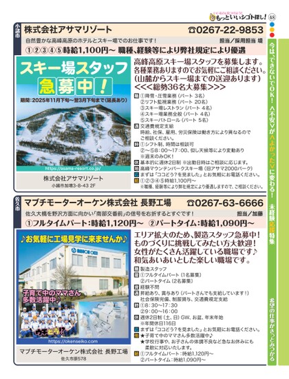 48●●●今は、できないでOK!<不安>が<よかった>に変わる!未経験応援特集希望の仕事がきっとみつかる自然豊かな高峰高原のホテルとスキー場でのお仕事です!①②③④⑤時給1,100円〜職種、経験等により弊社規定により優遇担当/採用担当堤☎0267-22-9853株式会社アサマリゾート小諸市スキー場スタッフ急募中!期間:2025年11月下旬〜翌3月下旬まで(延長あり)https://asama-resort.co.jp/株式会社アサマリゾート小諸市加増3-8-432F高峰高原スキー場スタッフを募集します。各種業務ありますのでお気軽にご相談ください。(山麓からスキー場までの送迎あります)<<<総勢36名大募集>>>①降雪・圧雪業務(パート3名)②リフト監視業務(パート20名)③スキー場レストラン(パート4名)④スキー場業務全般(パート4名)⑤スキーパトロール(パート5名)交通費規定支給時給、社保、雇用、労災保険は働き方により異なるのでご相談ください。①シフト制、時間は相談可②〜⑤8:00〜17:00、但し天候等により変動あり※週末のみOK!基本的に週休2日制※出勤日時はご相談に応じます。高峰マウンテンパークスキー場(旧アサマ2000パーク)まずは「ココどう?を見ました」とお気軽にお電話ください。①②③④⑤時給1,100円〜※職種、経験等により弊社規定により優遇しますので、ご相談ください。佐久大橋を野沢方面に向かい「南部交番前」の信号を右折するとすぐです!①フルタイムパート:時給1,120円〜②パートタイム:時給1,090円〜担当/加藤☎0267-63-6666マブチモーターオーケン株式会社長野工場佐久市♪お気軽に工場見学に来ませんか♪子育て中のママさん多数活躍中♪https://okenseiko.comマブチモーターオーケン株式会社長野工場佐久市原578エリア拡大のため、製造スタッフ急募中!ものづくりに挑戦してみたい方大歓迎!女性がたくさん活躍している職場です♪和気あいあいとした楽しい職場です。製造スタッフ①フルタイムパート(1名募集)②パートタイム(2名募集)経験不問昇給あり、賞与あり(パートさんでも支給しています!)社会保険完備、制服貸与、交通費規定支給①8:30〜17:30②9:00〜16:00週休2日制(土、日)GW、お盆、年末年始※年間休日116日まずは「ココどう?を見ました」とお気軽にお電話ください。★子育て中のママさん多数活躍中♪★学校行事や、お子さんの体調不良など急なお休みにも柔軟に対応いたします。①フルタイムパート:時給1,120円〜②パートタイム:時給1,090円〜