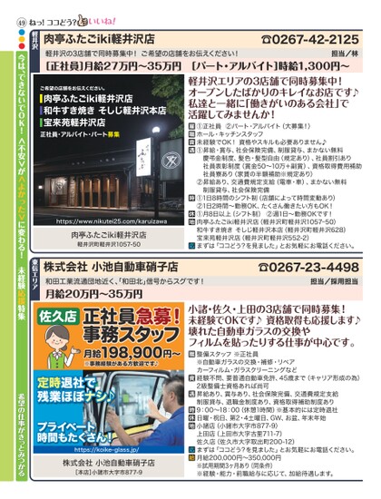 ☎0267-42-2125担当/林[正社員]月給27万円〜35万円[パート・アルバイト]時給1,300円〜ご希望の店舗をお伝えください。肉亭ふたごiki軽井沢店和牛すき焼きそしじ軽井沢本店宝来苑軽井沢店正社員・アルバイト・パート募集https://www.nikutei25.com/karuizawa肉亭ふたごiki軽井沢店軽井沢町軽井沢1057-50軽井沢エリアの3店舗で同時募集中!オープンしたばかりのキレイなお店です♪私達と一緒に「働きがいのある会社」で活躍してみませんか!①正社員②パート・アルバイト(大募集!)ホール・キッチンスタッフ未経験でOK!資格やスキルも必要ありません♪①昇給・賞与、社会保険完備、制服貸与、まかない無料慶弔金制度、髪色・髪型自由(規定あり)、社員割引あり社員表彰制度(賞金50〜10万+副賞)、資格取得費用補助社員寮あり(家賃の半額補助※規定あり)②昇給あり、交通費規定支給(電車・車)、まかない無料制服貸与、社会保険完備①1日8時間のシフト制(店舗によって時間変動あり)②1日2時間〜勤務OK、たくさん働きたい方もOK!①月8日以上(シフト制)②週1日〜勤務OKです!肉亭ふたごiki軽井沢店(軽井沢町軽井沢1057ー50)和牛すき焼きそしじ軽井沢本店(軽井沢町軽井沢628)宝来苑軽井沢店(軽井沢町軽井沢552-2)まずは「ココどう?を見ました」とお気軽にお電話ください。☎0267-23-4498担当/採用担当株式会社小池自動車硝子店和田工業流通団地近く、和田北」信号からスグです!月給20万円〜35万円東信エリア軽井沢の3店舗で同時募集中!ご希望の店舗をお伝えください!肉亭ふたごiki軽井沢店軽井沢ねっ!ココどう?49●●●今は、できないでOK!<不安>が<よかった>に変わる!未経験応援特集小諸・佐久・上田の3店舗で同時募集!未経験でOKです♪資格取得も応援します♪壊れた自動車ガラスの交換やフィルムを貼ったりする仕事が中心です。整備スタッフ※正社員※自動車ガラスの交換・補修・リペアカーフィルム・ガラスクリーニングなど経験不問、要普通自動車免許、45歳まで(キャリア形成の為)2級整備士資格あれば尚可昇給あり、賞与あり、社会保険完備、交通費規定支給制服貸与、退職金制度あり、資格取得補助制度あり9:00〜18:00(休憩1時間)※基本的には定時退社日曜・祝日、第2・4土曜日、GW、お盆、年末年始小諸店(小諸市大字市877-9)上田店(上田市大字古里711-7)佐久店(佐久市大字取出町200-12)まずは「ココどう?を見ました」とお気軽にお電話ください。月給200,000円〜350,000円※試用期間3ヶ月あり(同条件)※経験・能力・前職給与に応じて、加給待遇します。佐久店正社員急募!事務スタッフ月給198,900※事務経験がある方歓迎です♪円〜定時退社で残業ほぼナシ♪プライベート時間もたくさん!https://koike-glass.jp/株式会社小池自動車硝子店[本店]小諸市大字市877-9希望の仕事がきっとみつかる