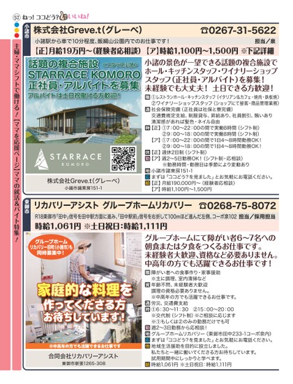 アルバイトは土日祝働ける方歓迎!小諸の景色が一望できる話題の複合施設でホール・キッチンスタッフ・ワイナリーショップスタッフ(正社員・アルバイト)を募集!未経験でも大丈夫!土日できる方歓迎!①レストランホール・キッチンスタッフ(イタリアン&カフェ・焼肉・鉄板焼)②ワイナリーショップスタッフ(ショップにて接客・商品管理業務)社会保険完備(正社員は社保と寮完備)交通費規定支給、制服貸与、昇給あり、社員割引、賄いあり清潔感があれば髪色・ネイル自由【正】①7:00〜22:00の間で実働8時間(シフト制)②9:00〜18:00の間で実働8時間(シフト制)【ア】①7:00〜22:00の間で1日4〜8時間勤務OK!②9:00〜18:00の間で1日4〜8時間勤務OK!【正】週休2日制(シフト制)【ア】週2〜5日勤務OK!(シフト制・応相談)※勤務時間・勤務日は季節により変動あり小諸市諸東房151-1まずは「ココどう?を見ました」とお気軽にお電話ください。【正】月給190,000円〜(経験者応相談)【ア】時給1,100円〜1,500円小諸駅から車で10分程度、飯綱山公園内でのお仕事です!担当/泉【正】月給19万円〜(経験者応相談)【ア】時給1,100円〜1,500円※下記詳細☎0267-31-5622株式会社Greve.t(グレーベ)小諸市●●●57ねっ!ココどう?話題の複合施設STARRACEKOMORO正社員・アルバイトを募集<スタラス小諸>主婦・ママシフトで働ける!【ママを応援ページ】ママの就活&バイト特集東御市!株式会社Greve.t(グレーベ)小諸市諸東房151-1リカバリーアシストグループホームリカバリー☎0268-75-8072R18東御市「田中」信号を田中駅方面に進み、田中駅前」信号を右折して100mほど進んだ左側、コーポ泉102担当/採用担当時給1,061円※土日祝日:時給1,111円グループホームリカバリー田町(小諸市)も同時募集中!家庭的な料理を料理作ってくださる方お待ちしています!※中高年の方でも活躍できるお仕事です合同会社リカバリーアシスト東御市新張1265-308グループホームにて障がい者6〜7名への朝食または夕食をつくるお仕事です。未経験者大歓迎、資格など必要ありません。中高年の方でも活躍できるお仕事です!障がい者への食事作り・家事援助※主に調理、室内清掃など年齢不問、未経験者大歓迎調理の資格必要ありません。※中高年の方でも活躍できるお仕事です。労災、交通費支給①6:30〜11:30②15:00〜20:00※交代制(シフト制)※ご相談に応じます※①もしくは②のみの勤務だけでも可週2〜3日勤務から応相談!グループホームリカバリー(東御市田中233-1コーポ泉内)まずは「ココどう?を見ました」とお気軽にお電話ください。地域生活援助を目的に設立しました。私たちと一緒に働いてくださる方お待ちしています。試用期間中にしっかりと学べます。時給1,061円※土日祝日:時給1,111円