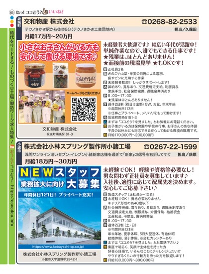 ☎0268-82-2533担当/久保田交和物産株式会社テクノさかき駅から徒歩5分(テクノさかき工業団地内)月給17万円〜20万円坂城町ねっ!ココどう?小さなお子さんがいる方も安心して働ける環境です♪ホームページもご覧ください交和物産株式会社坂城町南条5181-3未経験者大歓迎です♪幅広い年代が活躍中!単純作業なので、誰でもできる仕事です!★残業は、ほとんどありません!★面接前の現場見学★もOKです!正社員3名きのこや山菜・果実の目視による選別、袋やビンに充填する作業未経験者歓迎!しっかりサポートします!昇給あり、賞与あり、交通費規定支給、制服貸与家族手当、社会保険完備、退職金共済あり8:00〜17:00★残業はほとんどありません!週休2日制(祝日は出勤)GW、お盆、年末年始※年間休日113日※仕事とプライべート、メリハリをもって働けます!坂城町南条5181-3まずは「ココどう?を見ました」とお気軽にお電話ください。お子様がいる方は保育園や学校の行事、お子さんの急な体調不良のお休みにも対応できる安心して働ける環境の職場です。月給170,000円〜200,000円浅間サンライン沿いセブン-イレブン小諸新家店様を過ぎて「新家」の信号を右折してすぐ月給18万円〜30万円NEWスタッフ業務拡大に向け大募集年間休日121日!プライベート充実!https://www.kobayashi-sp.co.jp/株式会社小林スプリング製作所小諸工場小諸市大字滋野甲3942-1未経験でOK!経験や資格等必要なし!男女問わず正社員を募集しています♪入社後、適性に応じて配属先を決めます。安心してご応募下さい♪製造スタッフ(正社員5〜10名)未経験でOK!資格必要ありませんキャリア形成の為40歳以下社会保険完備、賞与あり、昇給あり、退職金制度あり交通費規定支給、制服貸与、介護保険、結婚祝金出産祝金、弔慰金、傷病見舞金8:00〜17:00週休2日制(土・日)※年間休日121日年末年始、夏季休暇、5月大型連休、有給休暇結婚休暇、忌引休暇、※会社カレンダーありまずは「ココどう?を見ました」とお電話下さい♪素直で明るく、笑顔で主体性を持った方好奇心旺盛で、いろんなことにチャレンジしたい方やりすぎるくらいの行動力を持った方を歓迎します!月給180,000円〜300,000円☎0267-22-1599担当/荻原株式会社小林スプリング製作所小諸工場小諸市61●●●時代をリードする!ものづくり工場・製造ワーク求人特集!おうちでココどう!https://cocodou.info