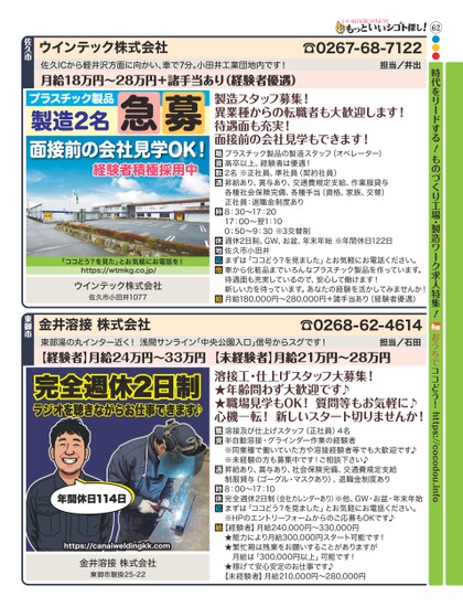 62●●●時代をリードする!ものづくり工場・製造ワーク求人特集!おうちでココどう!https://cocodou.info製造スタッフ募集!異業種からの転職者も大歓迎します!待遇面も充実!面接前の会社見学もできます!プラスチック製品の製造スタッフ(オペレーター)高卒以上、経験者は優遇!2名※正社員、準社員(契約社員)昇給あり、賞与あり、交通費規定支給、作業服貸与各種社会保険完備、各種手当(資格、家族、交替)正社員:退職金制度あり8:30〜17:2017:00〜翌1:100:50〜9:30※3交替制週休2日制、GW、お盆、年末年始※年間休日122日佐久市小田井まずは「ココどう?を見ました」とお気軽にお電話ください。車から化粧品までいろんなプラスチック製品を作っています。待遇面も充実しているので、安心して働けます!新しい力を待っています。あなたの経験を活かしてみませんか!月給180,000円〜280,000円+諸手当あり(経験者優遇)☎0267-68-7122担当/井出佐久ICから軽井沢方面に向かい、車で7分。小田井工業団地内です!月給18万円〜28万円+諸手当あり(経験者優遇)ウインテック株式会社佐久市プラスチック製品急募製造2名面接前の会社見学OK!経験者積極採用中「ココどう?を見た」とお気軽にお電話を!https://wtmkg.co.jp/ウインテック株式会社佐久市小田井1077東部湯の丸インター近く!浅間サンライン「中央公園入口」信号からスグです!【経験者】月給24万円〜33万円【未経験者】月給21万円〜28万円担当/石田完全週休2日制ラジオを聴きながらお仕事できます♪溶接工・仕上げスタッフ大募集!★年齢問わず大歓迎です♪★職場見学もOK!質問等もお気軽に♪心機一転!新しいスタート切りませんか!溶接及び仕上げスタッフ(正社員)4名半自動溶接・グラインダー作業の経験者※同業種で働いていた方や溶接経験者等でも大歓迎です♪※未経験の方も募集中です!ご相談下さい♪昇給あり、賞与あり、社会保険完備、交通費規定支給制服貸与(ゴーグル・マスクあり)、退職金制度あり8:00〜17:10完全週休2日制(会社カレンダーあり)※他、GW・お盆・年末年始まずは「ココどう?を見ました」とお気軽にお電話ください。※HPのエントリーフォームからのご応募もOKです♪【経験者】月給240,000円〜330,000円★能力により月給300,000円スタート可能です!★繁忙期は残業をお願いすることがありますが月給は「300,000円以上」可能です!★稼げて安心安定のお仕事です♪【未経験者】月給210,000円〜280,000円年間休日114日https://canaiweldingkk.com金井溶接株式会社東御市鞍掛25-22☎0268-62-4614金井溶接株式会社東御市