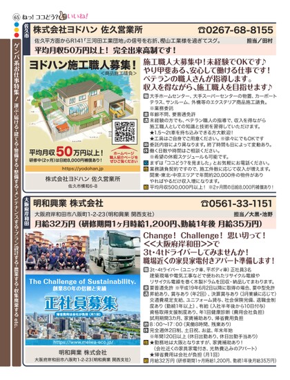 ☎0267-68-8155担当/田村佐久平方面からR141「三河田工業団地」の信号を右折、樫山工業様を過ぎてスグ。平均月収50万円以上!完全出来高制です!ヨドハン施工職人募集!<商品施工請負>平均月収50研修中(2ヶ月)は日給8,000円補償あり!https://yodohan.jp万円以上!ホームページ職人紹介ページをぜひご覧ください株式会社ヨドハン佐久営業所佐久市横和6-8施工職人大募集中!未経験でOKです♪やり甲斐ある、安心して働ける仕事です!ベテランの職人さんが指導します。収入を得ながら、施工職人を目指せます♪大手ホームセンター、大手スーパーセンターの物置、カーポートテラス、サンルーム、外構等のエクステリア商品施工請負。※業務委託年齢不問、要普通免許未経験の方でも、ベテラン職人の指導で、収入を得ながら施工職人としての知識と技術を習得していただけます。★1.5〜2t車を持ち込みできる方大歓迎!★工具はご自身でご用意ください。※徐々にでもOKです委託内容により異なります。終了時間も日によって変動あり。働く日数や時間はご相談ください。※希望の休暇スケジュールも可能です。まずは「ココどう?を見ました」とお気軽にお電話ください。業務請負契約ですので、施工件数に応じて収入が増えます。関東・東北・中京エリアで年間約20,000件の物件がありやればやるだけ収入増になります。平均月収500,000円以上!※2ヶ月間の日給8,000円補償あり!株式会社ヨドハン佐久営業所佐久市ねっ!ココどう?☎0561-33-1151大阪府岸和田市八阪町1-2-23(明和興業関西支社)月給32万円(研修期間1ヶ月時給1,200円、勤続1年後月給35万円)Change!Challenge!思い切って!<<大阪府岸和田>>で3t・4tドライバーしてみませんか!職場近くの家具家電付きアパート準備します!担当/大黒・池野TheChallengeofSustainability.創業80年の信頼と実績正社員募集帰省費用は会社が負担(月1回)https://www.meiwa-eco.jp/明和興業株式会社大阪府岸和田市八阪町1-2-23(明和興業関西支社)3t・4tライバー(ユニック車、平ボディ車)正社員3名建築現場や電気工事などで使われたリサイクル電線やリサイクル電線を巻く木製ドラムを回収・納品してまわります。要普通免許※平成19年6月2日以降に取得の場合、要中型免許昇給あり、賞与あり(年2回)、決算賞与あり(3月業績に応じて)交通費規定支給、ユニフォーム貸与、社会保険完備、退職金制度あり(勤続1年以上)、有給(入社半年後から10日付与)資格取得支援制度あり、年1回健康診断(費用会社負担)試用期間3カ月、家賃補助あり、帰省費用負担8:00〜17:00(実働8時間、残業あり)完全週休2日制、土日祝、お盆、年末年始※年間120日以上(休日出勤あり、休日出勤手当あり)★勤務地は大阪となりますが、家賃補助あり!(会社近くの家具家電付き、光熱費込みのアパート)★帰省費用は会社が負担(月1回)月給32万円(研修期間1ヶ月時給1,200円、勤続1年後月給35万円)明和興業株式会社大阪府岸和田65●●●ゲンバ系お仕事特集!運ぶ・届ける・建てる・警備する・整備する・メンテナンスする・プラン設計する・農業する・収集廃棄するetc.