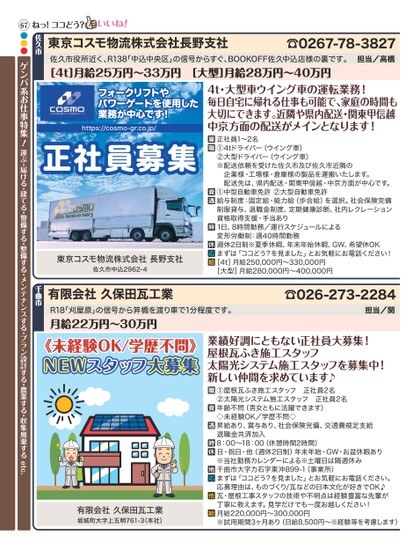 佐久市役所近く、R138「中込中央区」の信号からすぐ、BOOKOFF佐久中込店様の裏です。[4t]月給25万円〜33万円[大型]月給28万円〜40万円担当/高橋☎0267-78-3827東京コスモ物流株式会社長野支社佐久市フォークリフトやパワーゲートを使用した業務が中心です!https://cosmo-gr.co.jp/4t・大型車ウイング車の運転業務!毎日自宅に帰れる仕事も可能で、家庭の時間も大切にできます。近隣や県内配送・関東甲信越中京方面の配送がメインとなります!正社員募集東京コスモ物流株式会社長野支社佐久市中込2962-4正社員1〜2名①4tドライバー(ウイング車)②大型ドライバー(ウイング車)※配送依頼を受けた佐久市及び佐久市近隣の企業様・工場様・倉庫様の製品を運搬いたします。配送先は、県内配送・関東甲信越・中京方面が中心です。①中型自動車免許②大型自動車免許給与制度:固定給・能力給(歩合給)を選択。社会保険完備制服貸与、退職金制度、定期健康診断、社内レクレーション資格取得支援・手当あり1日、8時間勤務/運行スケジュールによる変形労働制:週40時間勤務週休2日制※夏季休暇、年末年始休暇、GW、希望休OKまずは「ココどう?を見ました」とお気軽にお電話ください![4t]月給250,000円〜330,000円[大型]月給280,000円〜400,000円☎026-273-2284担当/関有限会社久保田瓦工業R18「刈屋原」の信号から笄橋を渡り車で1分程度です。月給22万円〜30万円千曲市《未経験OK/学歴不問》NEWスタッフ大募集有限会社久保田瓦工業坂城町大字上五明761-3(本社)業績好調にともない正社員大募集!屋根瓦ふき施工スタッフ太陽光システム施工スタッフを募集中!新しい仲間を求めています♪①屋根瓦ふき施工スタッフ正社員2名②太陽光システム施工スタッフ正社員2名年齢不問(男女ともに活躍できます)◇未経験OK/学歴不問◇昇給あり、賞与あり、社会保険完備、交通費規定支給退職金共済加入8:00〜18:00(休憩時間2時間)日・祝日・他(週休2日制)年末年始・GW・お盆休暇あり※当社勤務カレンダーによる※土曜日は隔週休み千曲市大字力石字東沖899-1(事業所)まずは「ココどう?を見ました」とお気軽にお電話ください。応募理由は、ものづくり/瓦などの日本文化が好きでOK♪瓦・屋根工事スタッフの技術や不明点は経験豊富な先輩が丁寧に教えます。見学だけでも一度お越しください!月給220,000円〜300,000円※試用期間3ヶ月あり(日給8,500円〜※経験等を考慮します)ねっ!ココどう?67●●●ゲンバ系お仕事特集!運ぶ・届ける・建てる・警備する・整備する・メンテナンスする・プラン設計する・農業する・収集廃棄するetc.