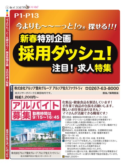 ☎0267-63-8000担当/採用担当株式会社アルソア慧央グループアルソア佐久ファクトリィ佐久リサーチパーク工業団地内です。時給1,200円〜佐久市ねっ!ココどう?P1-P131●●●「今よりもっと!を探せる!」新春特別企画注目の求人特集化粧品・健康食品を製造しています!手作業で商品の包装をお願いします。難しいお仕事はありません♪ママさんが活躍できる職場です♪化粧品・健康食品の充填包装スタッフ(3〜5名)◎空調・クリーンルーム完備の清潔な作業環境です!◎高台に位置した眺望の素晴らしい工場です。◎アットホームな雰囲気と明るいスタッフが多い職場です♪高卒以上、未経験でOKです!昇給あり、社会保険完備、制服貸与、交通費規定支給有給休暇あり、育児休業あり、介護・看護休業あり9:15〜16:45週休2日制(土、日、祝)GW、お盆、年末年始まずは「ココどう?を見ました」とお気軽にお電話ください。◎子育て中のママさんが活躍できる職場です♪◎学校行事や、お子さんの体調不良など急なお休みにも柔軟に対応いたします。◎良質な水と豊かな大地、醸成発酵に不可欠な寒暖差など自然のエネルギーに満ちた環境で製品を製造しています。時給1,200円〜アルバイト募集勤務時間は9:15〜16:45https://www.arsoa-keio-group.co.jp/株式会社アルソア慧央グループアルソア佐久ファクトリィ佐久市瀬戸553-7佐久リサーチパーク希望の仕事がきっとみつかる