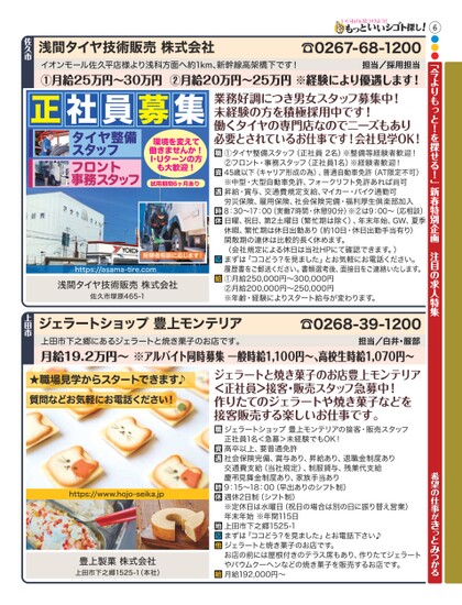 6●●●「今よりもっと!を探せる!」新春特別企画注目の求人特集業務好調につき男女スタッフ募集中!未経験の方を積極採用中です!働くタイヤの専門店なのでニーズもあり必要とされているお仕事です!会社見学OK!①タイヤ整備スタッフ(正社員2名)※整備等経験者歓迎!②フロント・事務スタッフ(正社員1名)※経験者歓迎!45歳以下(キャリア形成の為)、普通自動車免許(AT限定不可)※中型・大型自動車免許、フォークリフト免許あれば尚可昇給・賞与、交通費規定支給、マイカー・バイク通勤可労災保険、雇用保険、社会保険完備・福利厚生倶楽部加入8:30〜17:00(実働7時間・休憩90分)※②は9:00〜(応相談)日曜、祝日、第2土曜日(繁忙期は除く)、年末年始、GW、夏季休暇、繁忙期は休日出勤あり(約10日・休日出勤手当有り)閑散期の連休は比較的長く休めます。(会社規定による休日は当社HPにて確認できます。)まずは「ココどう?を見ました」とお気軽にお電話ください。履歴書をご郵送ください。書類選考後、面接日をご連絡いたします。①月給250,000円〜300,000円②月給200,000円〜250,000円※年齢・経験によりスタート給与が変わります。希望の仕事がきっとみつかるジェラートショップ豊上モンテリアの接客・販売スタッフ正社員1名<急募>未経験でもOK!高卒以上、要普通免許社会保険完備、賞与あり、昇給あり、退職金制度あり交通費支給(当社規定)、制服貸与、残業代支給慶弔見舞金制度あり、家族手当あり9:15〜18:00(早出ありのシフト制)週休2日制(シフト制)※定休日は水曜日(祝日の場合は別の日に振り替え営業)年末年始※年間115日上田市下之郷1525-1まずは「ココどう?を見ました」とお電話下さい♪ジェラートと焼き菓子のお店です。お店の前には屋根付きのテラス席もあり、作りたてジェラートやバウムクーヘンなどの焼き菓子を販売するお店です。月給192,000円〜ジェラートと焼き菓子のお店豊上モンテリア<正社員>接客・販売スタッフ急募中!作りたてのジェラートや焼き菓子などを接客販売する楽しいお仕事です。★職場見学からスタートできます♪質問などお気軽にお電話ください!https://www.hojo-seika.jp豊上製菓株式会社上田市下之郷1525-1(本社)上田市下之郷にあるジェラートと焼き菓子のお店です。月給19.2万円〜※アルバイト同時募集一般時給1,100円〜、高校生時給1,070円〜担当/白井・服部☎0268-39-1200ジェラートショップ豊上モンテリア上田市担当/採用担当イオンモール佐久平店様より浅科方面へ約1km、新幹線高架橋下です!①月給25万円〜30万円②月給20万円〜25万円※経験により優遇します!☎0267-68-1200浅間タイヤ技術販売株式会社佐久市正社員募集タイヤ整備スタッフフロント事務スタッフ環境を変えて働きませんか!IUターンの方も大歓迎!試用期間6ヶ月あり経験者相談に応じます!https://asama-tire.com浅間タイヤ技術販売株式会社佐久市塚原465-1