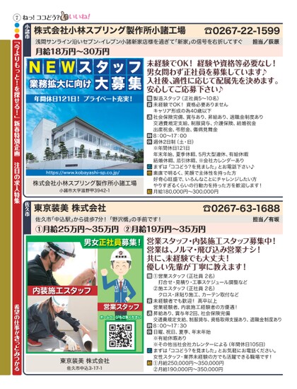 ☎0267-22-1599担当/荻原浅間サンライン沿いセブン-イレブン小諸新家店様を過ぎて「新家」の信号を右折してすぐ月給18万円〜30万円NEWスタッフ業務拡大に向け大募集年間休日121日!プライベート充実!https://www.kobayashi-sp.co.jp/株式会社小林スプリング製作所小諸工場小諸市大字滋野甲3942-1未経験でOK!経験や資格等必要なし!男女問わず正社員を募集しています♪入社後、適性に応じて配属先を決めます。安心してご応募下さい♪製造スタッフ(正社員5〜10名)未経験でOK!資格必要ありませんキャリア形成の為40歳以下社会保険完備、賞与あり、昇給あり、退職金制度あり交通費規定支給、制服貸与、介護保険、結婚祝金出産祝金、弔慰金、傷病見舞金8:00〜17:00週休2日制(土・日)※年間休日121日年末年始、夏季休暇、5月大型連休、有給休暇結婚休暇、忌引休暇、※会社カレンダーありまずは「ココどう?を見ました」とお電話下さい♪素直で明るく、笑顔で主体性を持った方好奇心旺盛で、いろんなことにチャレンジしたい方やりすぎるくらいの行動力を持った方を歓迎します!月給180,000円〜300,000円株式会社小林スプリング製作所小諸工場小諸市ねっ!ココどう?☎0267-63-1688担当/有坂佐久市「中込駅」から徒歩7分!「野沢橋」の手前です!①月給25万円〜35万円②月給19万円〜35万円東京装美株式会社佐久市7●●●「今よりもっと!を探せる!」新春特別企画注目の求人特集男女正社員募集!内装施工スタッフ営業スタッフホームページもご覧ください東京装美株式会社佐久市中込3-17-1営業スタッフ・内装施工スタッフ募集中!営業は、ノルマ・飛び込み営業ナシ!共に、未経験でも大丈夫!優しい先輩が丁寧に教えます!①営業スタッフ(正社員2名)打合せ・見積り・工事スケジュール調整など②施エスタッフ(正社員2名)クロス・床貼り施工、カーテン取付など未経験者でも歓迎!高卒以上営業経験者、内装施工経験者の方優遇!昇給あり、賞与年2回、社会保険完備交通費規定支給、制服貸与、資格取得支援あり、退職金制度あり8:00〜17:30日曜、祝日、夏季、年末年始※有給休暇あり※その他当社会社カレンターによる(年間休日105日)まずは「ココどう?を見ました」とお気軽にお電話ください。女性スタッフ・業界未経験の方でも活躍できる職場です!①月給250,000円〜350,000円②月給190,000円〜350,000円希望の仕事がきっとみつかる