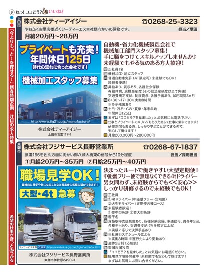 ☎0268-25-3323担当/塚田株式会社ティーアイジーやおふく古里店様近くシーティーエス本社様向かいの建物です。月給20万円〜28万円上田市ねっ!ココどう?プライベートも充実!年間休日125日時代の流れに合った会社です!機械加工スタッフ募集http://www.tig21.co.jp/manufacture/株式会社ティーアイジー上田市古里117-1自動機・省力化機械製造会社で機械加工部門スタッフ募集!手に職をつけてスキルアップしませんか♪未経験でもやる気のある方大歓迎!正社員1名機械加工・組立スタッフ普通自動車免許(AT限定可)未経験でもOK!経験者優遇!昇給あり、賞与あり、各種社会保険有給休暇、退職金制度(その他法定制度は全て完備)交通費規定支給、制服貸与、各種手当あり、試用期間3ヵ月8:30〜17:30※実働8時間※多少残業あり土日・祝日・GW・夏季・年末年始年間休日125日まずは「ココどう?を見ました」とお気軽にお電話下さい仕事とプライべートのメリハリもあり充実して仕事に集中できます!研修期間もある為、しっかり学ぶことができるので、安心して働けます!月給200,000円〜280,000円☎0268-67-1837担当/採用担当県道166を佐久方面に向かい御八城大橋東の信号から10分程度①月給20万円〜35万円②月給25万円〜40万円株式会社フジサービス長野営業所東御市9●●●「今よりもっと!を探せる!」新春特別企画注目の求人特集決まったルートで働きやすい大型定期便!中距離フリー便で無理なくできる4tドライバー男女問わず、未経験からでも<<安心>>しっかり研修するので未経験でもOK!正社員①4tドライバー(中距離フリー・定期便)②大型ドライバー(定期便各種コース)未経験者歓迎!①要中型免許②要大型免許若干名資格取得支援制度あり、各種保険完備、車通勤可、賞与年2回、各種手当あり、交通費支給(当社規定による)※実績に応じて決算手当あり当社運行スケジュールによる※実働8時間※運行先により変動あり週休2日制(応相談)東御市御牧原「ココどう?を見ました」とお気軽にお電話ください。職場見学随時開催中!未経験でも安心して稼げます!まずはお気軽にお問い合せください。職場見学OK!面接前に見学や気になることなど担当者に気軽に話ができます!大型・4t急募フジサービス長野https://www.hakuai-grp.com/fujiservice/index.html株式会社フジサービス長野営業所東御市御牧原2490-3希望の仕事がきっとみつかる