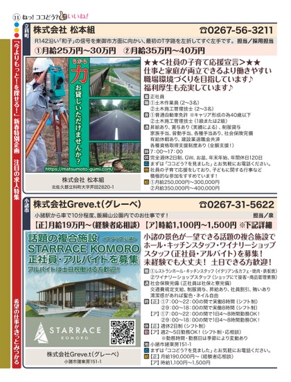 ねっ!ココどう?株式会社松本組R142沿い「和子」の信号を東御市方面に向かい、最初のT字路を左折してすぐ左手です。担当/採用担当①月給25万円〜30万円②月給35万円〜40万円☎0267-56-3211★★<社員の子育て応援宣言>★★仕事と家庭が両立できるより働きやすい職場環境づくりを目指しています♪福利厚生も充実しています♪正社員①土木作業員(2〜3名)②土木施工管理技士(2〜3名)①普通自動車免許※キャリア形成の為40歳以下②土木施工管理技士(1級または2級)昇給あり、賞与あり(実績による)、制服貸与家族手当、皆勤手当、各種手当あり、社会保険完備有給休暇あり、建設業退職金共済各種資格取得支援制度あり(全額支援!)7:00〜17:00完全週休2日制、GW、お盆、年末年始、年間休日120日まずは「ココどう?を見ました」とお気軽にお電話ください。社員の子育て応援をしており、子どもに関する行事など積極的な参加をすすめています!①月給250,000円〜300,000円②月給350,000円〜400,000円から力ちお貸しいただけませんか?https://matsumoto-gumi.com/株式会社松本組北佐久郡立科町大字田2820-1株式会社Greve.t(グレーベ)☎0267-31-5622小諸駅から車で10分程度、飯綱山公園内でのお仕事です!担当/泉【正】月給19万円〜(経験者応相談)【ア】時給1,100円〜1,500円※下記詳細小諸の景色が一望できる話題の複合施設でホール・キッチンスタッフ・ワイナリーショップスタッフ(正社員・アルバイト)を募集!未経験でも大丈夫!土日できる方歓迎!①レストランホール・キッチンスタッフ(イタリアン&カフェ・焼肉・鉄板焼)②ワイナリーショップスタッフ(ショップにて接客・商品管理業務)社会保険完備(正社員は社保と寮完備)交通費規定支給、制服貸与、昇給あり、社員割引、賄いあり清潔感があれば髪色・ネイル自由【正】①7:00〜22:00の間で実働8時間(シフト制)②9:00〜18:00の間で実働8時間(シフト制)【ア】①7:00〜22:00の間で1日4〜8時間勤務OK!②9:00〜18:00の間で1日4〜8時間勤務OK!【正】週休2日制(シフト制)【ア】週2〜5日勤務OK!(シフト制・応相談)※勤務時間・勤務日は季節により変動あり小諸市諸東房151-1まずは「ココどう?を見ました」とお気軽にお電話ください。【正】月給190,000円〜(経験者応相談)【ア】時給1,100円〜1,500円話題の複合施設STARRACEKOMORO正社員・アルバイトを募集<スタラス小諸>アルバイトは土日祝働ける方歓迎!株式会社Greve.t(グレーベ)小諸市諸東房151-1希望の仕事がきっとみつかる立科町小諸市11●●●「今よりもっと!を探せる!」新春特別企画注目の求人特集