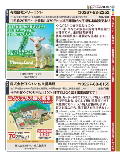12●●●「今よりもっと!を探せる!」新春特別企画注目の求人特集担当/土屋R142を望月方面へ。布施温泉入口」を左折し県道150号を道なりに車で5分程!①月給20万円〜②時給1,070円〜※試用期間(6ヶ月)後に時給変更あり農業・牧場経験者優遇します!正社員・パート募集!未経験でも大丈夫!幅広い年齢層の方が活躍できます!https://merry-land.co.jp/有限会社メリーランド佐久市布施365<<どうぶつ好き集まれ!>>ヤギ・羊・牛などの家畜の飼育作業全般のお仕事です。未経験者歓迎!農業・牧場関連の経験者を優遇します。①正社員②パート家畜の飼育作業全般(やり・清掃・草刈りなど)未経験者歓迎!要普通免許(MT望ましいが、ATのみでも可)60歳定年の為59歳までの方※①のみ①昇給あり、社会保険完備、交通費規定支給賞与あり(業績に応じて)②昇給あり、雇用・労災保険、交通費規定支給※条件により社会保険も可①8:00〜18:00(実働8時間)※残業あり(最大40時間)②8:00〜12:00、14:00〜18:00※選択可能(応相談)※8:00〜18:00の間でフルタイム勤務も可能(応相談)①週休2日※土日出勤もありシフト制(応相談)②週2〜3日勤務からOK!※6月〜11月までのお仕事です!まずは「ココどう?を見ました」とお気軽にお電話ください。①月給200,000円〜※試用期間中(6ヶ月)時給1,061円②時給1,070円〜※試用期間(6ヶ月)後に時給変更あり☎0267-53-2252有限会社メリーランド佐久市佐久平方面からR141「三河田工業団地」の信号を右折、樫山工業様を過ぎてスグ。平均月収<<70万円以上!>>日当ではなく完全出来高制です!担当/田村☎0267-68-8155株式会社ヨドハン佐久営業所佐久市希望の仕事がきっとみつかる大手ホームセンター、大手スーパーセンターの物置、カーポートテラス、サンルーム、外構等のエクステリア商品施工請負。※業務委託となります。日程の調整は可能です。年齢不問、要普通免許未経験の方でも、ベテラン職人の指導で、収入を得ながら施工職人としての知識と技術を習得していただけます。★1.5〜2t車を持ち込みできる方大歓迎!(リース制度あり)★工具はご自身でご用意ください。※貸付制度あり委託内容により異なります。終了時間も日によって変動あり。働く日数や時間はご相談ください。※希望の休暇スケジュールも可能です。まずは「ココどう?を見ました」とお気軽にお電話ください。業務請負契約ですので、施工件数に応じて収入が増えます。関東・東北・中京エリアで年間約20,000件の物件がありやればやるだけ収入増になります。平均月収700,000円以上!※2ヶ月間の日給8,000円補償あり!物置、カーポート等のエクステリア職人大募集!やり甲斐ある、安心して働ける仕事です!未経験でもベテラン職人が指導します。収入を得ながら、施工職人を目指せます♪エクステリア職人募集!エクステリア職人募集!<業務委託>物置オーニングガレージ砂利敷カーポートサンルームテラスデッキ人工芝アプローチフェンスブロック土間コンクリート平均月収70万円以上!研修中(2ヶ月)は日給8,000円補償あり!https://yodohan.jp株式会社ヨドハン佐久営業所佐久市横和6-8門扉外構業者様募集中請負金額は都度ご相談させていただきます。