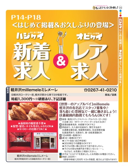 14●●●はじめて掲載!お久しぶり掲載特集!P14-P18<はじめて掲載&お久しぶりの登場>はじめて掲載新着求人お久しぶり登場レア求人&☎0267-41-0210担当/店長軽井沢millemeleミレメーレ旧軽井沢ロータリー前、軽井沢駅から車で3分程度です。時給1,300円〜※研修あり、下記詳細軽井沢[世界一のアップルパイ]millemele軽井沢の有名店でスタッフ募集中♪落ち着いた雰囲気で一緒に働きましょう!扶養範囲内勤務でもちろんOKです!接客・販売スタッフ※パート・アルバイト(2〜3名)※主婦(夫)・Wワーク・フリーターどなたもOK!普通自動車免許、未経験でOKです♪昇給あり、大入袋の支給あり、繁忙手当あり交通費全額支給、制服無料貸与、社会保険完備社員登用あり、社割あり、車・自転車通勤OK1日4時間〜勤務OK!週1日〜勤務OKです!★シフト自由(自己申告制)★30分単位での調整もOKです!★子どもの習い事に合わせて送り迎えしたい。★子どもの急な体調不良で家にいないと・・・。などなど、お気軽にご相談ください。まずは「ココどう?を見ました」とお気軽にお電話ください。時給1,300円〜(研修中時給1,200円※3ヶ月程度、能力により変わります)★面接時の履歴書不要★★髪型・髪色・ネイル等おしゃれもOK★★9:00〜の出勤でOK!★https://no1marco.com/軽井沢millemeleミレメーレ軽井沢町軽井沢1-2(旧軽井沢ロータリー前)