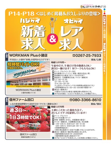 16●●●はじめて掲載!お久しぶり掲載特集!P14-P18<はじめて掲載&お久しぶりの登場>はじめて掲載新着求人お久しぶり登場レア求人&☎0267-25-7933担当/上原時給1,070円〜午前中だけ、午後だけ等の勤務もOK♪週3日〜働けます!WワークもちろんOK!WORKMANPlus小諸店R18沿い、小諸市「加増」の信号からスグです!小諸市短時間バイトOK!ご相談ください。パート・アルバイト(2〜3名)店内業務スタッフ(レジ・接客・商品の品出し等)未経験の方大歓迎、Wワークの方もOK!昇給あり、交通費規定支給、マイカー通勤OK①7:00〜9:00②7:00〜12:00③14:00〜20:00※上記のシフトがメインですが時間帯は相談OKです♪※研修期間中は15:00〜20:00の間で勤務です!週3日〜勤務OK!※週5日できる方大歓迎!勤務日数も相談OKです。まずはお気軽に「ココどう?を見ました」とお電話下さい。https://www.workman.co.jpWORKMANPlus小諸店小諸市加増2-11-10☎080-3366-8610担当/田口しなの鉄道滋野駅から徒歩10分!マイカー通勤もOK!信州ファーム田口東御市週3日〜1日3時間でOK!https://www.shinshu-farm.jp/信州ファーム田口東御市滋野乙147-2時給1,070円土耕にこだわった栽培方法で、おいしいイチゴを提供しています!パート・アルバイトイチゴの収獲スタッフ学歴・経験問いません、未経験者大歓迎!マイカー通勤OK、交通費規定支給、労災保険(1月〜2月)6:30または7:00〜9:00(3月〜6月)5:30または6:00〜9:00※時間帯相談OK!※繁忙期は最長14:00までお願いすることもあります。週3日〜勤務OK!曜日等は相談に応じます。※雇用期間2026年1月〜2026年6月※雇用期間の延長も相談OKです!まずは「ココどう?を見ました」とお気軽にお電話ください。
