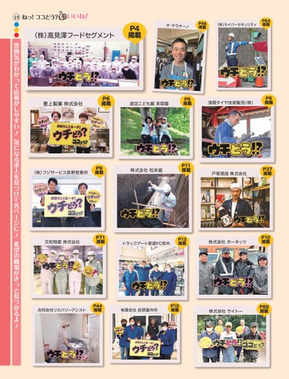 ねっ!ココどう?(株)高見澤フードセグメントP4掲載オ・サラチーノP46掲載(株)セイバーセキュリティP64掲載豊上製菓株式会社P6掲載認定こども園芙蓉園P5掲載浅間タイヤ技術販売(株)P6掲載(株)フジサービス長野営業所P9掲載株式会社松本組P11掲載戸塚酒造株式会社P37掲載交和物産株式会社P71掲載トラックアート歌麿FC信州P13掲載株式会社ホーネッツP10掲載合同会社リカバリーアシストP44掲載有限会社荻原製作所P10掲載株式会社サイトーP59掲載19●●●雰囲気がわかって応募がしやすい!気になる求人を見つけて各ページに!希望の職場がきっと見つかるよ!