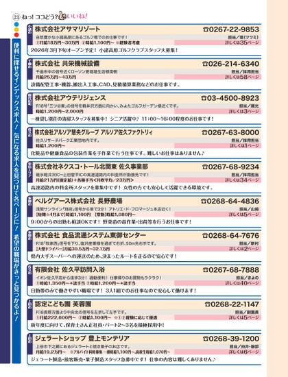 ☎0267-22-9853担当/堤(ツツミ)詳しくは35ページ☎026-214-6340担当/採用担当詳しくは58ページ2026年3月下旬オープン予定!小諸高原ゴルフクラブスタッフ大募集!株式会社アサマリゾート自然豊かな小諸高原にあるゴルフ場でのお仕事です!①月給18万円〜30万円②時給1,100円〜※経験者考慮小諸市設備配管工事・機器、搬出入工事、CAD、見積積算業務などのお仕事です。株式会社共栄機械設備千曲市中の信号近くローソン更埴埴生店様南側月給25万円〜43万円千曲市☎03-4500-8923担当/國光詳しくは3ページ株式会社アウテリジェンスR18号「三ツ谷東」の信号を軽井沢方面に向かい、みよたゴルフガーデン様近くです。時給1,200円〜2,000円御代田町一棟貸し別荘の清掃スタッフを募集中!シニア活躍中♪11:00〜16:00程度のお仕事です!☎0267-63-8000担当/採用担当詳しくは1ページ株式会社アルソア慧央グループアルソア佐久ファクトリィ佐久リサーチパーク工業団地内です。時給1,200円〜佐久市化粧品や健康食品の包装作業を手作業で行う仕事です。難しいお仕事はありません♪☎0267-68-9234担当/採用担当詳しくは34ページ株式会社ネクスコ・トール北関東佐久事業部碓氷軽井沢IC〜上田菅平ICの高速道路内の料金所が勤務先です!月給21万円(固定給)+各種手当<月収平均/23万円>東信エリア高速道路内の料金所スタッフを募集中です!女性の方でも安心して活躍できる環境です。ねっ!ココどう?☎0268-64-4836担当/山﨑詳しくは5ページ☎0268-64-7676担当/新村詳しくは2ページ☎0267-68-7888担当/きよの詳しくは40ページ☎0268-22-1147担当/副園長詳しくは5ページ☎0268-39-1200担当/白井・服部詳しくは6ページ9:00からの出勤も相談OKです!野菜苗の苗作業・出荷等を行うお仕事です!浅間サンライン「別府」信号から車で3分!アトリエ・ド・フロマージュ本店近く!【短期※4月まで】時給1,100円【常勤】時給1,080円〜ベルグアース株式会社長野農場東御市日勤帯のみで働きやすい職場です!3人1組でのお仕事なので安心して働けます!有限会社佐久平訪問入浴イオン佐久平店から徒歩3分!通勤便利!仕事帰りのお買物もラクラク!①時給1,350円〜+諸手当②時給1,200円〜+諸手当佐久市県内大手スーパーへの運送のため、決まったルートを走るので安心です!新年度に向けて、保育士さん正社員・パート2〜3名を積極採用中!認定こども園芙蓉園R18長野方面より中央北の信号を左折して左手です。①月給222,600円〜②時給1,100円〜※①②経験に応じて優遇上田市ジェラートショップ豊上モンテリア上田市下之郷にあるジェラートと焼き菓子のお店です。月給19.2万円〜※アルバイト同時募集一般時給1,100円〜、高校生時給1,070円〜上田市R18「牧家西」信号を下り、塩沢産業様を過ぎて右折、50m先右手です。株式会社食品流通システム東御センター東御市【大型ドライバー】月給30.5万円〜32.1万円ジェラート製造・接客販売・菓子製造スタッフ急募中です!仕事の内容は難しくありません♪23●●●便利に探せるインデックス求人!気になる求人を見つけて各ページに!希望の職場がきっと見つかるよ!