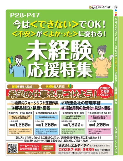 28●●●今は、できないでOK!<不安>が<よかった>に変わる!未経験応援特集希望の仕事がきっとみつかるP28-P47今は<できない>でOK!<不安>が<よかった>に変わる!未経験応援特集転職希望者大歓迎!未経験者大歓迎!お気軽にご相談ください!希望の仕事を見つけよう!①倉庫内フォークリフト運転作業③部品組立・検査・梱包②物流会社の管理事務④福祉用具の仕分け・洗浄・梱包①倉庫内フォークリフト運転作業②物流会社の管理事務③部品組立・検査・梱包④福祉用具の仕分け・洗浄・梱包フォークリフト免許あれば尚可正社員登用制度あり正社員登用制度あり上田市・派遣時給1,250円上田市・派遣時給1,250円10kg程度の重量物取り扱いあります!御代田町・派遣時給1,300円介護ベッド、車いすなど重量物あります!佐久市・派遣時給1,200円時間:7:20〜16:30実働7時間50分休日:日・祝+その他(週休2日制)交通費規定支給時間:7:20〜16:30実働7時間50分休日:日・祝+その他(週休2日制)交通費規定支給時間:8:15〜17:05実働7時間45分休日:土・日・祝休み交通費規定支給時間:8:30〜17:30実働8時間休日:土・日・祝休み交通費規定支給寮に入って仕事したい方もご相談ください。調理・清掃・事務などご案内出来ます!掲載以外のお仕事や職種を希望の方、お気軽にご相談ください。ホームページにてお仕事情報掲載!受付中!https://www.mti-jp.com/24時間登録株式会社エムテイアイ佐久市佐久平駅北26-3☎0267-66-3639厚生労働大臣許可●派遣:派20-110003/紹介:20-ユ-110002担当/採用担当