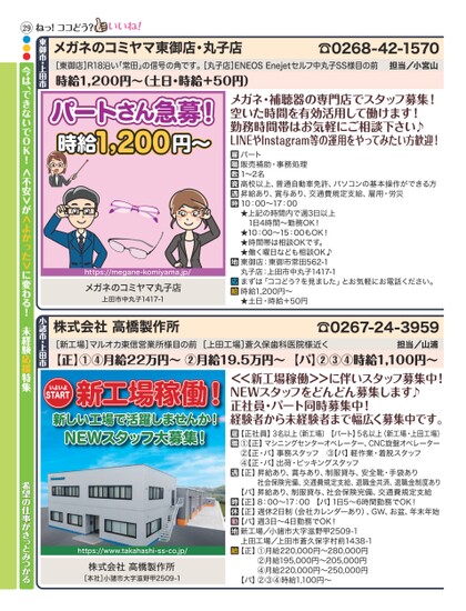 ねっ!ココどう?メガネのコミヤマ東御店・丸子店☎0268-42-1570担当/小宮山[東御店]R18沿い「常田」の信号の角です。[丸子店]ENEOSEnejetセルフ中丸子SS様目の前時給1,200円〜(土日・時給+50円)パートさん急募!時給1,200円〜https://megane-komiyama.jp/メガネのコミヤマ丸子店上田市中丸子1417-1メガネ・補聴器の専門店でスタッフ募集!空いた時間を有効活用して働けます!勤務時間帯はお気軽にご相談下さい♪LINEやInstagram等の運用をやってみたい方歓迎!パート販売補助・事務処理1〜2名高校以上、普通自動車免許、パソコンの基本操作ができる方昇給あり、賞与あり、交通費規定支給、雇用・労災10:00〜17:00★上記の時間内で週3日以上1日4時間〜勤務OK!★10:00〜15:00もOK!★時間帯は相談OKです。★働く曜日なども相談OK♪東御店:東御市常田562-1丸子店:上田市中丸子1417-1まずは「ココどう?を見ました」とお気軽にお電話ください。時給1,200円〜★土日・時給+50円株式会社高橋製作所☎0267-24-3959担当/山浦[新工場]マルオカ東信営業所様目の前[上田工場]蒼久保歯科医院様近く【正】①④月給22万円〜②月給19.5万円〜【パ】②③④時給1,100円〜<<新工場稼働>>に伴いスタッフ募集中!NEWスタッフをどんどん募集します♪正社員・パート同時募集中!経験者から未経験者まで幅広く募集中です。【正社員】3名以上(新工場)【パート】5名以上(新工場・上田工場)①【正】マシニングセンターオペレーター、CNC旋盤オペレーター②【正・パ】事務スタッフ③【パ】軽作業・着脱スタッフ④【正・パ】出荷・ピッキングスタッフ【正】昇給あり、賞与あり、制服貸与、安全靴・手袋あり社会保険完備、交通費規定支給、退職金共済、退職金制度あり【パ】昇給あり、制服貸与、社会保険完備、交通費規定支給【正】8:00〜17:00【パ】1日5〜6時間勤務でOK!【正】週休2日制(会社カレンダーあり)、GW、お盆、年末年始【パ】週3日〜4日勤務でOK!新工場/小諸市大字滋野甲2509-1上田工場/上田市蒼久保字村前1438-1【正】①月給220,000円〜280,000円②月給195,000円〜205,000円④月給220,000円〜250,000円【パ】②③④時給1,100円〜いよいよSTART新工場稼働!新しい工場で活躍しませんか!NEWスタッフ大募集!https://www.takahashi-ss-co.jp/株式会社高橋製作所[本社]小諸市大字滋野甲2509-1希望の仕事がきっとみつかる東御市・上田市小諸市・上田市29●●●今は、できないでOK!<不安>が<よかった>に変わる!未経験応援特集