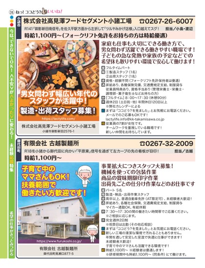 家庭も仕事も大切にできる働き方で、男女問わず活躍できる働きやすい職場です!子どもの急な発熱や家族の予定などでの希望休も取りやすい環境で安心して働けます!フルタイムパート①製造スタッフ(1名)②出荷スタッフ(1名)資格・経験不問(フォークリフト免許保持者は優遇)昇給あり、各種保険完備、交通費規定支給、制服貸与従業員特典あり、資格手当あり(管理栄養士・栄養士・調理師・菓子衛生士などお持ちの方)[フルタイム]8:00〜17:30(休憩90分)週休2日(土日祝・他)年間休日120日以上※弊社カレンダーによるまずは「ココどう?を見ました」とお気軽にお電話ください。メールでのご応募もOKです!lactylife.info@kk-takamisawa.co.jp従業員の7割が女性です。チームワークを重視している職場です!新しい仲間をお待ちしています。男女問わず幅広い年代のスタッフが活躍中!製造・出荷スタッフ募集!https://lactylife.com/株式会社高見澤フードセグメント小諸工場小諸市御影新田2576-1R141「御影新田南信号」を佐久平駅方面から左折して「ツルヤみかげ店様」入口越えてスグ!時給1,100円〜(フォークリフト免許をお持ちの方は時給優遇)担当/小島・渡辺☎0267-26-6007株式会社高見澤フードセグメント小諸工場小諸市ねっ!ココどう?R18を小諸から御代田に向かい「平原東」信号を過ぎて左カーブの先の看板が目印!時給1,100円〜☎0267-32-2009担当/古越有限会社古越製麺所御代田町31●●●今は、できないでOK!<不安>が<よかった>に変わる!未経験応援特集事業拡大につきスタッフ大募集!機械を使っての包装作業商品の賞味期限印字作業出荷先ごとの仕分け作業などのお仕事ですパート5名製造・検品・出荷作業スタッフ高卒以上、普通自動車免許(AT限定可)、未経験者大歓迎!昇給あり、各種社会保険、交通費規定支給、制服貸与マイカー通勤OK、有給休暇7:30〜17:30の間の働きたい時間帯でご応募ください。※ご相談に応じます。完全週休2日制※祝祭日は出勤(その他応相談)まずは「ココどう?を見ました」とお気軽にお電話ください。新しい工場の清潔な環境で汚れることもありません。年間を通して安定した室温で快適に仕事ができます!未経験者大歓迎!子育て中のママさんも活躍できる環境です!時給1,100円〜※経験者は優遇します!※研修期間中も時給1,100円〜(同条件)にて働けます。子育て中のママさんもOK!扶養範囲で働きたい方歓迎です!https://www.furukoshi.co.jp/有限会社古越製麺所御代田町馬瀬口877-5希望の仕事がきっとみつかる