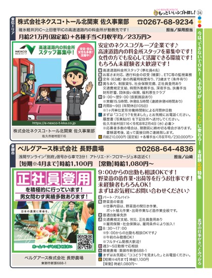 34●●●今は、できないでOK!<不安>が<よかった>に変わる!未経験応援特集希望の仕事がきっとみつかる株式会社ネクスコ・トール北関東佐久事業部☎0267-68-9234碓氷軽井沢IC〜上田菅平ICの高速道路内の料金所が勤務先です!月給21万円(固定給)+各種手当<月収平均/23万円>担当/採用担当東信エリア安定・安心女性も多数!活躍中!https://e-nexco-t-kka.co.jp株式会社ネクスコ・トール北関東佐久事業部佐久市岩村田116安定のネクスコグループ企業です♪高速道路内の料金所スタッフを募集中です!女性の方でも安心して活躍できる環境です!もちろん未経験者大歓迎です!高速道路料金所スタッフ(準社員4名)お客さま対応、通行料金の収受(精算)、ETC等の監視業務定年(63歳)後の再雇用制度有り、73歳まで(条件有り)賞与あり、制服貸与、社会保険完備、正社員登用あり交通費規定支給、時間外勤務手当、深夜手当、扶養手当財形貯蓄、団体扱い保険、福利厚生クラブ9:00〜翌9:00(仮眠施設あり)※実働15.5時間、休憩8.5時間(連続休憩4時間あり)月間8〜9日(年間休日105日)※1ヶ月単位変形労働時間制による月間休日数まずは「ココどう?を見ました」とお気軽にお電話ください。履歴書(写真貼付)を下記住所へ送付してください。佐久市岩村田116<令和8年2月4日(水)必着>※応募者多数の場合は、期限前に締め切る場合があります。書類選考後、追って面接日時ご連絡致します。月給210,000円(固定給)+各種手当<月収平均/230,000円>☎0268-64-4836担当/山﨑浅間サンライン「別府」信号から車で3分!アトリエ・ド・フロマージュ本店近く!【短期※4月まで】時給1,100円【常勤】時給1,080円〜ベルグアース株式会社長野農場東御市正社員登用を積極的に行っています!男女問わず実績多数あります!ホームページもご覧くださいベルグアース株式会社長野農場東御市新張688-19:00からの出勤も相談OKです!野菜苗の苗作業・出荷等を行うお仕事です!未経験者もちろんOK!まずはお気軽にお問い合わせください♪パート・アルバイト野菜苗の育苗※仕事内容は、野菜苗の間引き作業、ポット植え作業・出荷作業など苗作業全般です。普通自動車免許交通費規定支給、労災、正社員登用あり※雇用保険・社会保険は、雇用条件により加入!8:30〜17:00※9:00からの出勤も相談OKです♪※午前のみ勤務OK!※フルタイム勤務大歓迎!週3〜5日勤務で応相談横堰農場:東御市新張688-1まずはお気軽に「ココどう?を見ました」とお電話ください。【短期※4月まで】時給1,100円【常勤】時給1,080円〜