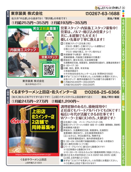 36●●●今は、できないでOK!<不安>が<よかった>に変わる!未経験応援特集東京装美株式会社佐久市「中込駅」から徒歩7分!「野沢橋」の手前です!①月給25万円〜35万円②月給19万円〜35万円☎0267-63-1688担当/有坂男女正社員募集!内装施工スタッフ営業スタッフホームページもご覧ください東京装美株式会社佐久市中込3-17-1営業スタッフ・内装施工スタッフ募集中!営業は、ノルマ・飛び込み営業ナシ!共に、未経験でも大丈夫!優しい先輩が丁寧に教えます!①営業スタッフ(正社員2名)打合せ・見積り・工事スケジュール調整など②施エスタッフ(正社員2名)クロス・床貼り施工、カーテン取付など未経験者でも歓迎!高卒以上営業経験者、内装施工経験者の方優遇!昇給あり、賞与年2回、社会保険完備交通費規定支給、制服貸与、資格取得支援あり、退職金制度あり8:00〜17:30日曜、祝日、夏季、年末年始※有給休暇あり※その他当社会社カレンターによる(年間休日105日)まずは「ココどう?を見ました」とお気軽にお電話ください。女性スタッフ・業界未経験の方でも活躍できる職場です!①月給250,000円〜350,000円②月給190,000円〜350,000円くるまやラーメン上田店・佐久インター店[佐久]佐久I.Cを下りてすぐ近くです![上田]イオンスタイル上田店様すぐ近く①月給24万円〜27万円②時給1,200円〜☎0268-25-6366担当/坪川・坂田佐久市上田市・佐久市調理経験のある方、積極採用中!正社員でもパートアルバイトでもOKです!幅広い年代が活躍できるお仕事です!Wワーク・主婦(夫)の方、大歓迎です♪正社員2〜3名パート・アルバイト2〜3名接客スタッフ(ラーメンの提供・接客・ホール業務・調理補助、清掃等)未経験者大歓迎!昇給あり、交通費規定支給、制服貸与、社員割引食事補助(規定あり)、正社員登用制度あり希望の仕事がきっとみつかる[正]はさらに、休日出勤手当、残業手当財形貯蓄制度あり、海外研修制度あり9:00〜24:00の間で実働8時間シフト制※休憩あり[正]週休2日制(シフト制)[パート・アルバイト]週1日から勤務OKです!※1日2時間から勤務OKです!※10:00〜15:00もちろんOK!勤務時間帯ご相談ください。【佐久】佐久市岩村田北1-14-5(0267-68-3005:店長)【上田】上田市踏入2-1223まずは「ココどう?を見ました」とお気軽にお電話ください。※ご応募は上田店で受け付けます!上田店佐久インター店2店舗で同時募集中https://www.kurumayaramen.co.jp/くるまやラーメン上田店上田市踏入2-1223