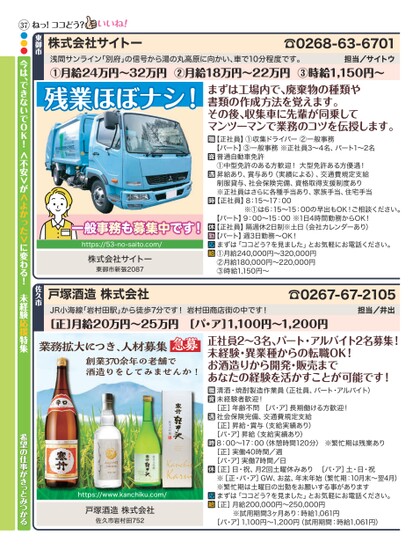 ねっ!ココどう?株式会社サイトー☎0268-63-6701浅間サンライン「別府」の信号から湯の丸高原に向かい、車で10分程度です。①月給24万円〜32万円②月給18万円〜22万円③時給1,150円〜担当/サイトウ残業ほぼナシ!まずは工場内で、廃棄物の種類や書類の作成方法を覚えます。その後、収集車に先輩が同乗してマンツーマンで業務のコツを伝授します。【正社員】①収集ドライバー②一般事務【パート】③一般事務※正社員3〜4名、パート1〜2名普通自動車免許①中型免許のある方歓迎!大型免許ある方優遇!昇給あり、賞与あり(実績による)、交通費規定支給制服貸与、社会保険完備、資格取得支援制度あり※正社員はさらに各種手当あり、家族手当、住宅手当【正社員】8:15〜17:00※①は6:15〜15:00の早出もOK!ご相談ください。【パート】9:00〜15:00※1日4時間勤務からOK!【正社員】隔週休2日制※土日(会社カレンダーあり)【パート】週3日勤務〜OK!まずは「ココどう?を見ました」とお気軽にお電話ください。①月給240,000円〜320,000円②月給180,000円〜220,000円③時給1,150円〜一般事務も募集中です!https://53-no-saito.com/株式会社サイトー東御市新張2087戸塚酒造株式会社JR小海線「岩村田駅」から徒歩7分です!岩村田商店街の中です![正]月給20万円〜25万円[パ・ア]1,100円〜1,200円☎0267-67-2105担当/井出業務拡大につき、人材募集急募創業370余年の老舗で酒造りをしてみませんか!正社員2〜3名、パート・アルバイト2名募集!未経験・異業種からの転職OK!お酒造りから開発・販売まであなたの経験を活かすことが可能です!清酒・焼酎製造作業員(正社員、パート・アルバイト)未経験者歓迎![正]年齢不問[パ・ア]長期働ける方歓迎!社会保険完備、交通費規定支給[正]昇給・賞与(支給実績あり)[パ・ア]昇給(支給実績あり)8:00〜17:00(休憩時間120分)※繁忙期は残業あり[正]実働40時間/週[パ・ア]実働7時間/日[正]日・祝、月2回土曜休みあり[パ・ア]土・日・祝※[正・パ・ア]GW、お盆、年末年始(繁忙期:10月末〜翌4月)※繁忙期は土曜日の出勤をお願いする事がありますまずは「ココどう?を見ました」とお気軽にお電話ください。[正]月給200,000円〜250,000円※試用期間3ヶ月あり:時給1,061円[パ・ア]1,100円〜1,200円(試用期間:時給1,061円)https://www.kanchiku.com/戸塚酒造株式会社佐久市岩村田752希望の仕事がきっとみつかる東御市佐久市37●●●今は、できないでOK!<不安>が<よかった>に変わる!未経験応援特集