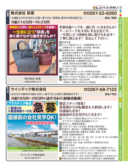 38●●●今は、できないでOK!<不安>が<よかった>に変わる!未経験応援特集☎0267-22-6260担当/荻原小諸駅よりR141を佐久方面へ車で3分。御幸町」信号の手前右側です。月給17.6万円〜19.2万円株式会社荻原小諸市事業拡大に伴い、新しいスタッフを募集!一生役に立つ「技術」を身に着けながら働きませんか?株式会社荻原小諸市与良町3-9-8革製高級バッグを一緒に作ってみませんか!チームワークを大切にする会社です。一生役に立つ技術を身に着けられます♪丁寧に教えます!安心して下さい♪契約社員①バッグ製造スタッフ②裁断業務スタッフ③事務スタッフ(検査・外注手配・軽作業)未経験でOK!普通自動車免許★男女問わず歓迎です!将来性のある会社です!★永続勤務できる方、やる気や自立心がある方大歓迎!★最初は簡単な作業から始めます!社会保険完備、交通費規定支給、制服貸与※昇給・賞与は会社の実績による。※入社6ヶ月後より正社員登用制度あり8:00〜17:00完全週休2日制(土・日)※年間休日108日※業務に支障が生じた場合は、残業・休日出勤になる場合があります。まずは「ココどう?を見ました」とお気軽にお電話ください。月給176,000円〜192,000円(研修中:時給1,100円※3ヶ月程度)☎0267-68-7122担当/井出佐久ICから軽井沢方面に向かい、車で7分。小田井工業団地内です!月給18万円〜28万円+諸手当あり(経験者優遇)ウインテック株式会社佐久市希望の仕事がきっとみつかる①プラスチック製品の製造スタッフ(オペレーター)②プラスチック製品の製造補助スタッフ高卒以上、経験者は優遇!①2名②1〜2名※正社員、準社員(契約社員)昇給あり、賞与あり、交通費規定支給、作業服貸与各種社会保険完備、各種手当(資格、家族、交替)正社員:退職金制度あり8:30〜17:20・16:30〜翌1:20・0:30〜9:20※3交替制※製造補助は8:30〜17:20週休2日制、GW、お盆、年末年始※年間休日122日佐久市小田井まずは「ココどう?を見ました」とお気軽にお電話ください。車から化粧品までいろんなプラスチック製品を作っています。待遇面も充実しているので、安心して働けます!新しい力を待っています。あなたの経験を活かしてみませんか!月給180,000円〜280,000円+諸手当あり(経験者優遇)製造スタッフ募集!異業種からの転職者も大歓迎します!待遇面も充実!面接前の会社見学もできます!プラスチック製品①製造2名②製造補助1〜2名急募面接前の会社見学OK!経験者積極採用中「ココどう?を見た」とお気軽にお電話を!https://wtmkg.co.jp/ウインテック株式会社佐久市小田井1077