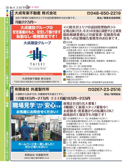☎048-650-2219担当/関東支店採用係大成有楽不動産株式会社当社で管理する軽井沢エリアの巡回管理物件のお仕事です。月給22万円〜軽井沢ねっ!ココどう?大成建設グループの安定基盤のもと、安定して働けます転勤なし・職務限定です!大成建設グループhttps://www.taisei-yuraku.co.jp/大成有楽不動産株式会社〒330-0843埼玉県さいたま市大宮区吉敷町4-262-14<<軽井沢エリアの巡回管理物件>>定期点検(月次、年次)の実施日調整や立会業務臨時修繕業務などの提案書・見積書作成客先への定期報告業務等のお仕事です。正社員※60歳定年(65歳まで再雇用あり)当社で管理する軽井沢エリアの巡回管理物件の設備管理※定期点検(月次、年次)の実施日調整や立会業務、臨時修繕業務などの提案書・見積書作成、客先への定期報告業務等のお仕事です。ビル設備管理経験がある方歓迎!社会保険完備、交通費全額支給、制服貸与、車通勤OK、有給休暇あり、他8:30〜17:30(休憩1時間)※ご不明な点などご相談ください。まずは「ココどう?を見ました」とお気軽にお電話ください。大成建設グループの安定基盤のもと、安定して働けます。転勤なし・職務限定です!月額220,000円〜(賞与年2回+時間外手当+深夜割増手当別途支給)☎0267-23-2516担当/採用担当小諸駅から徒歩10分、弁慶橋信号を越えてすぐ。①月給18万円〜27万円②③④月給18万円〜23万円有限会社共進製作所小諸市職場見学安心できるのでお気軽にお問合せください!です!新規正社員5名大募集!4職種にて新規スタッフ募集中!未経験者・異業種からの転職もOK!面接前の工場見学も可能です!①計画購買スタッフ1名(未経験者でもOK!)②NC旋盤金属切削加工スタッフ2名(未経験者でもOK!)③金属切断スタッフ1名(未経験者でもOK!)④MC機械加工スタッフ1名普通自動車免許(AT限定可)、未経験者OK昇給あり、賞与あり(昨年実績2回)制服支給、交通費規定支給、社保完備各種手当あり、試用期間3ヶ月あり8:00〜16:50※月10時間程度残業あり土・日、夏季、年末年始、GWその他会社カレンダーによる(年間120日)[本社工場]小諸市南町3-5-8「ココどう?を見ました」とお気軽にお電話ください。I・Uターンの方大歓迎!地元で働こう!①月給180,000円〜270,000円②③④月給180,000円〜230,000円ホームページを一新しました!ぜひご覧ください!https://kyoushin-ss.co.jp/有限会社共進製作所【本社工場】小諸市南町3-5-839●●●今は、できないでOK!<不安>が<よかった>に変わる!未経験応援特集希望の仕事がきっとみつかる