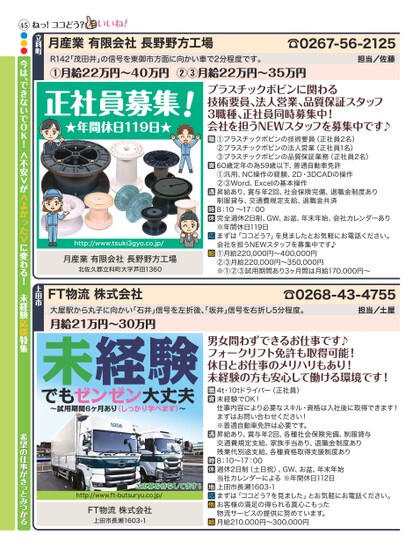 ねっ!ココどう?月産業有限会社長野野方工場R142「茂田井」の信号を東御市方面に向かい車で2分程度です。①月給22万円〜40万円②③月給22万円〜35万円☎0267-56-2125担当/佐藤正社員募集!★年間休日119日★プラスチックボビンに関わる技術要員、法人営業、品質保証スタッフ3職種、正社員同時募集中!会社を担うNEWスタッフを募集中です♪①プラスチックボビンの技術要員(正社員2名)②プラスチックボビンの法人営業(正社員1名)③プラスチックボビンの品質保証業務(正社員2名)60歳定年の為59歳以下、普通自動車免許①汎用、NC操作の経験、2D・3DCADの操作②③Word、Excelの基本操作昇給あり、賞与年2回、社会保険完備、退職金制度あり制服貸与、交通費規定支給、退職金共済8:10〜17:00完全週休2日制、GW、お盆、年末年始、会社カレンダーあり※年間休日119日まずは「ココどう?」を見ましたとお気軽にお電話ください。会社を担うNEWスタッフを募集中です♪①月給220,000円〜400,000円②③月給220,000円〜350,000円※①②③試用期間あり3ヶ月間は月給170,000円〜http://www.tsuki3gyo.co.jp/月産業有限会社長野野方工場北佐久郡立科町大字田1360FT物流株式会社大屋駅から丸子に向かい「石井」信号を左折後、坂井」信号を右折し5分程度。月給21万円〜30万円☎0268-43-4755担当/土屋男女問わずできるお仕事です♪フォークリフト免許も取得可能!休日とお仕事のメリハリもあり!未経験の方も安心して働ける環境です!4t・10tドライバー(正社員)未経験でOK!仕事内容により必要なスキル・資格は入社後に取得できます!まずはお問い合わせください!※普通自動車免許は必要です。昇給あり、賞与年2回、各種社会保険完備、制服貸与交通費規定支給、家族手当あり、退職金制度あり残業代別途支給、各種資格取得支援制度あり8:10〜17:00週休2日制(土日祝)、GW、お盆、年末年始当社カレンダーによる※年間休日112日上田市長瀬1603-1まずは「ココどう?を見ました」とお気軽にお電話ください。お客様の満足の得られる真心こもった物流サービスの提供に努めています。月給210,000円〜300,000円未経験でもゼンゼン大丈夫〜試用期間6ヶ月あり(しっかり学べます)〜ご応募お待ちしてます!http://www.ft-butsuryu.co.jp/FT物流株式会社上田市長瀬1603-1希望の仕事がきっとみつかる立科町上田市45●●●今は、できないでOK!<不安>が<よかった>に変わる!未経験応援特集