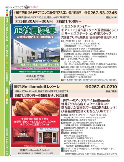 ☎0267-53-2345担当/小林(株)竹花組佐久チチブ生コン工場・望月アスコン・望月給油所佐久平周辺からクルマで15分位、通勤しやすい職場です。①②月給20万円〜30万円③時給1,100円〜佐久市正社員募集★地域に根ざして100周年★生コン車ドライバー<急募>作業スタッフ募集!・給油所スタッフ募集ほぼ定時で帰れるのでプライベートも充実できます!https://www.takehanagumi.co.jp/株式会社竹花組本社/佐久市望月30-1①生コン車ドライバー②アスコン工場作業スタッフ(幹部候補として)③サービスステーション作業スタッフ異業種からの転職歓迎!面接前の職場見学OK!①生コン車ドライバー(正社員1名)②アスコン工場作業スタッフ(正社員1名)③望月給油所(パート・アルバイト1名)①②③未経験者でもOK!*経験者優遇*昇給あり、賞与あり(昨年実績年2回・2ヶ月分)交通費支給(上限24,000円)、社会保険完備、育児休業あり社員旅行、資格取得推奨制度、スポーツ施設利用①「生コン工場」7:40〜17:10②「アスコン工場」7:30〜17:00③7:00〜19:00の間で最大8時間(ご希望時間での勤務可能)土曜日、日曜日、祝日、年末年始、GW、夏季※入社時より10日有給休暇付与※当社カレンダーによる(年間休日110日)佐久市塩名田1166-1(佐久チチブ生コン工場)佐久市望月1119(望月アスコン工場)佐久市望月37-19(望月給油所)※冬季、時間外で除雪・塩カルの仕事をやっていただける方は収入アップさせられます。☎0267-41-0210担当/店長軽井沢millemeleミレメーレ旧軽井沢ロータリー前、軽井沢駅から車で3分程度です。時給1,300円〜※研修あり、下記詳細軽井沢ねっ!ココどう?47●●●今は、できないでOK!<不安>が<よかった>に変わる!未経験応援特集[世界一のアップルパイ]millemele軽井沢の有名店でスタッフ募集中♪落ち着いた雰囲気で一緒に働きましょう!扶養範囲内勤務でもちろんOKです!接客・販売スタッフ※パート・アルバイト(2〜3名)※主婦(夫)・Wワーク・フリーターどなたもOK!普通自動車免許、未経験でOKです♪昇給あり、大入袋の支給あり、繁忙手当あり交通費全額支給、制服無料貸与、社会保険完備社員登用あり、社割あり、車・自転車通勤OK1日4時間〜勤務OK!週1日〜勤務OKです!★シフト自由(自己申告制)★30分単位での調整もOKです!★子どもの習い事に合わせて送り迎えしたい。★子どもの急な体調不良で家にいないと・・・。などなど、お気軽にご相談ください。まずは「ココどう?を見ました」とお気軽にお電話ください。時給1,300円〜(研修中時給1,200円※3ヶ月程度、能力により変わります)★面接時の履歴書不要★★髪型・髪色・ネイル等おしゃれもOK★★9:00〜の出勤でOK!★https://no1marco.com/軽井沢millemeleミレメーレ軽井沢町軽井沢1-2(旧軽井沢ロータリー前)希望の仕事がきっとみつかる