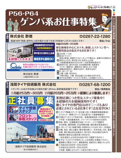 56●●●ゲンバ系お仕事特集!運ぶ・届ける・建てる・警備する・整備する・メンテナンスする・プラン設計する・農業する・収集廃棄するetc.国道18号「西原」信号を上田方面から来て右折(市街地へ)ガストの近くです!普通自動車免許の方もOK!※免許取得制度あり準中型(5t)免許以上必須未経験でも大丈夫!職場見学も随時OK!業界未経験の方でもOKです!先輩社員がサポートするので安心!https://www.sutoku.info/株式会社酢徳小諸市市町5-4-18月給20万円〜24万円東信地域を中心にホテル、旅館、レストラン等へ業務用食品を配送するお仕事です!正社員1〜2名配送ドライバー商品の配達、倉庫内でのピッキングや積込み、倉庫内の清掃など高卒以上の方、準中型(5t)免許以上必須※普通自動車免許の方もOK!(免許取得制度あり)昇給年1回、賞与年2回、社会保険完備、制服貸与マイカー通勤OK、通勤手当(規定により)支給退職金制度あり、精勤手当あり、家族手当あり8:30〜17:30土曜・日曜・祝日休み※繁忙期は、土曜・祝日出勤になる場合があります。まずはお気軽に「ココどう?を見た」とお電話ください。☎0267-22-1280担当/小山株式会社酢徳小諸市P56-P64ゲンバ系お仕事特集担当/採用担当イオンモール佐久平店様より浅科方面へ約1km、新幹線高架橋下です!①月給25万円〜30万円②月給20万円〜25万円※経験により優遇します!☎0267-68-1200浅間タイヤ技術販売株式会社佐久市正社員募集タイヤ整備スタッフフロント事務スタッフ環境を変えて働きませんか!IUターンの方も大歓迎!試用期間6ヶ月あり経験者相談に応じます!https://asama-tire.com浅間タイヤ技術販売株式会社佐久市塚原465-1業務好調につき男女スタッフ募集中!未経験の方を積極採用中です!働くタイヤの専門店なのでニーズもあり必要とされているお仕事です!会社見学OK!①タイヤ整備スタッフ(正社員2名)※整備等経験者歓迎!②フロント・事務スタッフ(正社員1名)※経験者歓迎!45歳以下(キャリア形成の為)、普通自動車免許(AT限定不可)※中型・大型自動車免許、フォークリフト免許あれば尚可昇給・賞与、交通費規定支給、マイカー・バイク通勤可労災保険、雇用保険、社会保険完備・福利厚生倶楽部加入8:30〜17:00(実働7時間・休憩90分)※②は9:00〜(応相談)日曜、祝日、第2土曜日(繁忙期は除く)、年末年始、GW、夏季休暇、繁忙期は休日出勤あり(約10日・休日出勤手当有り)閑散期の連休は比較的長く休めます。(会社規定による休日は当社HPにて確認できます。)まずは「ココどう?を見ました」とお気軽にお電話ください。履歴書をご郵送ください。書類選考後、面接日をご連絡いたします。①月給250,000円〜300,000円②月給200,000円〜250,000円※年齢・経験によりスタート給与が変わります。