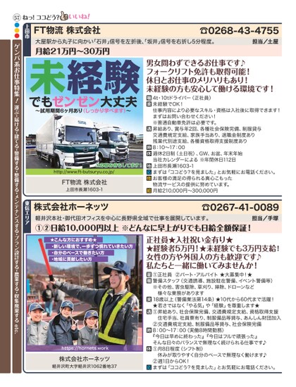 男女問わずできるお仕事です♪フォークリフト免許も取得可能!休日とお仕事のメリハリもあり!未経験の方も安心して働ける環境です!4t・10tドライバー(正社員)未経験でOK!仕事内容により必要なスキル・資格は入社後に取得できます!まずはお問い合わせください!※普通自動車免許は必要です。昇給あり、賞与年2回、各種社会保険完備、制服貸与交通費規定支給、家族手当あり、退職金制度あり残業代別途支給、各種資格取得支援制度あり8:10〜17:00週休2日制(土日祝)、GW、お盆、年末年始当社カレンダーによる※年間休日112日上田市長瀬1603-1まずは「ココどう?を見ました」とお気軽にお電話ください。お客様の満足の得られる真心こもった物流サービスの提供に努めています。月給210,000円〜300,000円☎0267-41-0089大屋駅から丸子に向かい「石井」信号を左折後、坂井」信号を右折し5分程度。月給21万円〜30万円☎0268-43-4755担当/土屋未経験でもゼンゼン大丈夫〜試用期間6ヶ月あり(しっかり学べます)〜FT物流株式会社上田市ねっ!ココどう?★こんな方におすすめ★・新しい環境で、一歩ずつ慣れていきたい方・自分のペースで働きたい方・地域に貢献したい方正社員★入社祝い金有り★★経験者5万円!★未経験でも3万円支給!女性の方や外国人の方も歓迎です♪私たちと一緒に働いてみませんか!①正社員②パート・アルバイト★大募集中!★警備スタッフ(交通誘導、施設駐在警備、イベント警備等)※その他、害虫駆除、草刈り、掃除、ドローンなど様々な業務があります18歳以上(警備業法第14条)★10代から60代まで活躍!★若さではなく「やる気」や「経験」を尊重します★①昇給あり、社会保険完備、交通費規定支給、資格取得支援住宅手当、社員寮有り、制服備品等貸与、あんしん財団加入②交通費規定支給、制服備品等貸与、社会保険完備8:00〜17:00(実働8時間勤務)『今日は早めに終わった』『今日はフルで頑張った』そんな日々のバランスで無理なく続けられる仕事です♪①月8日程度(シフト制)休みが取りやすく自分のペースで無理なく働けます♪②週1日からOK!まずは「ココどう?を見ました」とお気軽にお電話ください。https://hornets.work株式会社ホーネッツ軽井沢町大字軽井沢1062番地37軽井沢本社・御代田オフィスを中心に長野県全域で仕事を展開しています。①②日給10,000円以上※どんなに早上がりでも日給全額保証!担当/手塚株式会社ホーネッツ東信エリアご応募お待ちしてます!http://www.ft-butsuryu.co.jp/FT物流株式会社上田市長瀬1603-157●●●ゲンバ系お仕事特集!運ぶ・届ける・建てる・警備する・整備する・メンテナンスする・プラン設計する・農業する・収集廃棄するetc.