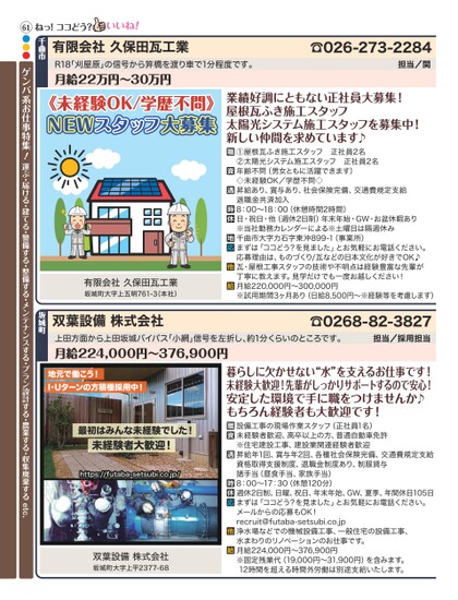 ☎026-273-2284担当/関有限会社久保田瓦工業R18「刈屋原」の信号から笄橋を渡り車で1分程度です。月給22万円〜30万円千曲市ねっ!ココどう?《未経験OK/学歴不問》NEWスタッフ大募集有限会社久保田瓦工業坂城町大字上五明761-3(本社)業績好調にともない正社員大募集!屋根瓦ふき施工スタッフ太陽光システム施工スタッフを募集中!新しい仲間を求めています♪①屋根瓦ふき施工スタッフ正社員2名②太陽光システム施工スタッフ正社員2名年齢不問(男女ともに活躍できます)◇未経験OK/学歴不問◇昇給あり、賞与あり、社会保険完備、交通費規定支給退職金共済加入8:00〜18:00(休憩時間2時間)日・祝日・他(週休2日制)年末年始・GW・お盆休暇あり※当社勤務カレンダーによる※土曜日は隔週休み千曲市大字力石字東沖899-1(事業所)まずは「ココどう?を見ました」とお気軽にお電話ください。応募理由は、ものづくり/瓦などの日本文化が好きでOK♪瓦・屋根工事スタッフの技術や不明点は経験豊富な先輩が丁寧に教えます。見学だけでも一度お越しください!月給220,000円〜300,000円※試用期間3ヶ月あり(日給8,500円〜※経験等を考慮します)上田方面から上田坂城バイパス「小網」信号を左折し、約1分くらいのところです。月給224,000円〜376,900円地元で働こう!I・Uターンの方積極採用中!最初はみんな未経験でした!未経験者大歓迎!https://futaba-setsubi.co.jp/双葉設備株式会社坂城町大字上平2377-68暮らしに欠かせない“水”を支えるお仕事です!未経験大歓迎!先輩がしっかりサポートするので安心!安定した環境で手に職をつけませんか♪もちろん経験者も大歓迎です!設備工事の現場作業スタッフ(正社員1名)未経験者歓迎、高卒以上の方、普通自動車免許※住宅建設工事、建設業関連経験者歓迎昇給年1回、賞与年2回、各種社会保険完備、交通費規定支給資格取得支援制度、退職金制度あり、制服貸与諸手当(昼食手当、家族手当)8:00〜17:30(休憩120分)週休2日制、日曜、祝日、年末年始、GW、夏季、年間休日105日まずは「ココどう?を見ました」とお気軽にお電話ください。メールからの応募もOK!recruit@futaba-setsubi.co.jp浄水場などでの機械設備工事、一般住宅の設備工事、水まわりのリノベーションのお仕事です。月給224,000円〜376,900円※固定残業代(19,000円〜31,900円)を含みます。12時間を超える時間外労働は別途支給いたします。☎0268-82-3827担当/採用担当双葉設備株式会社坂城町61●●●ゲンバ系お仕事特集!運ぶ・届ける・建てる・警備する・整備する・メンテナンスする・プラン設計する・農業する・収集廃棄するetc.