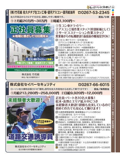 64●●●ゲンバ系お仕事特集!運ぶ・届ける・建てる・警備する・整備する・メンテナンスする・プラン設計する・農業する・収集廃棄するetc.ローソン佐久横和店様カドの「横和」信号を佐久市街地から右折して車で1分です!①月給213,280円〜258,000円②日給9,920円〜12,000円担当/採用担当☎0267-66-6015株式会社セイバーセキュリティ佐久市未経験者大歓迎!正社員10名パート10名募集中!シニアの方も活躍中です!道路交通誘導員https://www.saber-security.com/株式会社セイバーセキュリティ佐久市根々井字屋敷563番地1正社員・パート各10名大募集!松本・長野とエリア拡大中につき未経験者大歓迎!研修も充実しているので初めての方でも安心して働けます!交通誘導警備業務(雑踏警備はイベントの時のみ)※①正社員10名②パート10名未経験者OK!シニア・Wワークの方もOK!18歳以上(法令による)、交通誘導2級以上資格者優遇昇給あり、交通費規定支給、制服貸与、育児休業あり①社会保険完備、退職金制度あり、資格手当、精勤手当、遠方手当、出張手当、選任者手当、車輌補助手当、業務災害総合保険日焼け止め支給、熱中症対策(ドリンク支給・空調ベスト貸与)慶弔休暇、慶弔費、退職金積立②労働保険あり8:00〜17:00(実働8時間)①週休2日制(シフト制)週休3日でもOK!※その他会社カレンダー②週2〜3日勤務からOK!※週5日勤務できる方歓迎!※土日のみ勤務できる方歓迎!東信・北信・中信エリア①月給213,280円〜258,000円②日給9,920円〜12,000円※①②試用期間は時給1,061円☎0267-53-2345担当/小林(株)竹花組佐久チチブ生コン工場・望月アスコン・望月給油所佐久平周辺からクルマで15分位、通勤しやすい職場です。①②月給20万円〜30万円③時給1,100円〜佐久市正社員募集★地域に根ざして100周年★生コン車ドライバー<急募>作業スタッフ募集!・給油所スタッフ募集ほぼ定時で帰れるのでプライベートも充実できます!https://www.takehanagumi.co.jp/株式会社竹花組本社/佐久市望月30-1①生コン車ドライバー②アスコン工場作業スタッフ(幹部候補として)③サービスステーション作業スタッフ異業種からの転職歓迎!面接前の職場見学OK!①生コン車ドライバー(正社員1名)②アスコン工場作業スタッフ(正社員1名)③望月給油所(パート・アルバイト1名)①②③未経験者でもOK!*経験者優遇*昇給あり、賞与あり(昨年実績年2回・2ヶ月分)交通費支給(上限24,000円)、社会保険完備、育児休業あり社員旅行、資格取得推奨制度、スポーツ施設利用①「生コン工場」7:40〜17:10②「アスコン工場」7:30〜17:00③7:00〜19:00の間で最大8時間(ご希望時間での勤務可能)土曜日、日曜日、祝日、年末年始、GW、夏季※入社時より10日有給休暇付与※当社カレンダーによる(年間休日110日)佐久市塩名田1166-1(佐久チチブ生コン工場)佐久市望月1119(望月アスコン工場)佐久市望月37-19(望月給油所)※冬季、時間外で除雪・塩カルの仕事をやっていただける方は収入アップさせられます。