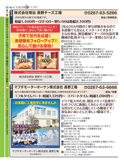 ☎0267-63-5266担当/採用担当株式会社明治長野チーズ工場佐久市ねっ!ココどう?明治グループの食品会社だからこそ!好待遇で、安心して長く働ける!子育て世代を応援!未経験をフォローアップ!安心して働ける環境!https://www.meiji.co.jp/株式会社明治長野チーズ工場佐久市平賀2082【安心】6カ月間の丁寧な研修があるので未経験でも安心してスタートできます♪主な仕事は、製造機械でチーズの包装作業機械の監視オペレーター業務となります。契約社員(3〜4名)★長期雇用を前提としています♪製造機械オペレーター経験不問、高校以上(深夜業務の為18歳以上)昇給あり、賞与あり、社会保険完備、制服貸与、深夜手当交通費規定支給、皆勤手当、時間外手当、年末年始手当次世代育成手当(20,000円/一人)、退職金制度あり①7:00〜15:15②15:00〜23:15③23:00〜翌7:15※①②③を月単位のローテーション勤務です。週休2日制(シフト制)GW、お盆、長期休暇取得可能です!まずは「ココどう?を見ました」とお気軽にお電話ください。<月収例>1,400円×7時間15分×21.9日で月給222,285円!頑張っただけ稼げます!佐久大橋を野沢方面に向かい「南部交番前」の信号を右折するとすぐです!①フルタイムパート:時給1,120円〜②パートタイム:時給1,090円〜担当/加藤☎0267-63-6666マブチモーターオーケン株式会社長野工場佐久市♪お気軽に工場見学に来ませんか♪子育て中のママさん多数活躍中♪https://okenseiko.comマブチモーターオーケン株式会社長野工場佐久市原578エリア拡大のため、製造スタッフ急募中!ものづくりに挑戦してみたい方大歓迎!女性がたくさん活躍している職場です♪和気あいあいとした楽しい職場です。製造スタッフ①フルタイムパート(1名募集)②パートタイム(1名募集)経験不問昇給あり、賞与あり(パートさんでも支給しています!)社会保険完備、制服貸与、交通費規定支給①8:30〜17:30②9:00〜16:00週休2日制(土、日)GW、お盆、年末年始※年間休日116日まずは「ココどう?を見ました」とお気軽にお電話ください。★子育て中のママさん多数活躍中♪★学校行事や、お子さんの体調不良など急なお休みにも柔軟に対応いたします。①フルタイムパート:時給1,120円〜②パートタイム:時給1,090円〜JR中込駅から車で3分程度です。時給1,400円〜(22:00〜翌5:00は時給2,100円)69●●●時代をリードする!ものづくり工場・製造ワーク求人特集!おうちでココどう!https://cocodou.info