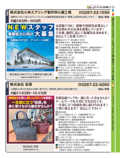 70●●●時代をリードする!ものづくり工場・製造ワーク求人特集!おうちでココどう!https://cocodou.info浅間サンライン沿いセブン-イレブン小諸新家店様を過ぎて「新家」の信号を右折してすぐ月給18万円〜30万円NEWスタッフ業務拡大に向け大募集年間休日121日!プライベート充実!https://www.kobayashi-sp.co.jp/株式会社小林スプリング製作所小諸工場小諸市大字滋野甲3942-1未経験でOK!経験や資格等必要なし!男女問わず正社員を募集しています♪入社後、適性に応じて配属先を決めます。安心してご応募下さい♪製造スタッフ(正社員5〜10名)未経験でOK!資格必要ありませんキャリア形成の為40歳以下社会保険完備、賞与あり、昇給あり、退職金制度あり交通費規定支給、制服貸与、介護保険、結婚祝金出産祝金、弔慰金、傷病見舞金8:00〜17:00週休2日制(土・日)※年間休日121日年末年始、夏季休暇、5月大型連休、有給休暇結婚休暇、忌引休暇、※会社カレンダーありまずは「ココどう?を見ました」とお電話下さい♪素直で明るく、笑顔で主体性を持った方好奇心旺盛で、いろんなことにチャレンジしたい方やりすぎるくらいの行動力を持った方を歓迎します!月給180,000円〜300,000円☎0267-22-1599担当/荻原株式会社小林スプリング製作所小諸工場小諸市☎0267-22-6260担当/荻原小諸駅よりR141を佐久方面へ車で3分。御幸町」信号の手前右側です。月給17.6万円〜19.2万円株式会社荻原小諸市事業拡大に伴い、新しいスタッフを募集!一生役に立つ「技術」を身に着けながら働きませんか?株式会社荻原小諸市与良町3-9-8革製高級バッグを一緒に作ってみませんか!チームワークを大切にする会社です。一生役に立つ技術を身に着けられます♪丁寧に教えます!安心して下さい♪契約社員①バッグ製造スタッフ②裁断業務スタッフ③事務スタッフ(検査・外注手配・軽作業)未経験でOK!普通自動車免許★男女問わず歓迎です!将来性のある会社です!★永続勤務できる方、やる気や自立心がある方大歓迎!★最初は簡単な作業から始めます!社会保険完備、交通費規定支給、制服貸与※昇給・賞与は会社の実績による。※入社6ヶ月後より正社員登用制度あり8:00〜17:00完全週休2日制(土・日)※年間休日108日※業務に支障が生じた場合は、残業・休日出勤になる場合があります。まずは「ココどう?を見ました」とお気軽にお電話ください。月給176,000円〜192,000円(研修中:時給1,100円※3ヶ月程度)