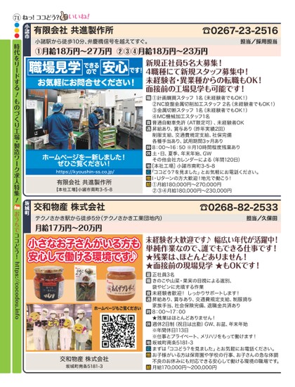 ☎0267-23-2516担当/採用担当有限会社共進製作所小諸市ねっ!ココどう?職場見学安心できるのでお気軽にお問合せください!です!新規正社員5名大募集!4職種にて新規スタッフ募集中!未経験者・異業種からの転職もOK!面接前の工場見学も可能です!①計画購買スタッフ1名(未経験者でもOK!)②NC旋盤金属切削加工スタッフ2名(未経験者でもOK!)③金属切断スタッフ1名(未経験者でもOK!)④MC機械加工スタッフ1名普通自動車免許(AT限定可)、未経験者OK昇給あり、賞与あり(昨年実績2回)制服支給、交通費規定支給、社保完備各種手当あり、試用期間3ヶ月あり8:00〜16:50※月10時間程度残業あり土・日、夏季、年末年始、GWその他会社カレンダーによる(年間120日)[本社工場]小諸市南町3-5-8「ココどう?を見ました」とお気軽にお電話ください。I・Uターンの方大歓迎!地元で働こう!①月給180,000円〜270,000円②③④月給180,000円〜230,000円ホームページを一新しました!ぜひご覧ください!https://kyoushin-ss.co.jp/有限会社共進製作所【本社工場】小諸市南町3-5-8☎0268-82-2533担当/久保田交和物産株式会社テクノさかき駅から徒歩5分(テクノさかき工業団地内)月給17万円〜20万円坂城町小さなお子さんがいる方も安心して働ける環境です♪ホームページもご覧ください交和物産株式会社坂城町南条5181-3未経験者大歓迎です♪幅広い年代が活躍中!単純作業なので、誰でもできる仕事です!★残業は、ほとんどありません!★面接前の現場見学★もOKです!正社員3名きのこや山菜・果実の目視による選別、袋やビンに充填する作業未経験者歓迎!しっかりサポートします!昇給あり、賞与あり、交通費規定支給、制服貸与家族手当、社会保険完備、退職金共済あり8:00〜17:00★残業はほとんどありません!週休2日制(祝日は出勤)GW、お盆、年末年始※年間休日113日※仕事とプライべート、メリハリをもって働けます!坂城町南条5181-3まずは「ココどう?を見ました」とお気軽にお電話ください。お子様がいる方は保育園や学校の行事、お子さんの急な体調不良のお休みにも対応できる安心して働ける環境の職場です。月給170,000円〜200,000円小諸駅から徒歩10分、弁慶橋信号を越えてすぐ。①月給18万円〜27万円②③④月給18万円〜23万円71●●●時代をリードする!ものづくり工場・製造ワーク求人特集!おうちでココどう!https://cocodou.info