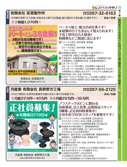 72●●●時代をリードする!ものづくり工場・製造ワーク求人特集!おうちでココどう!https://cocodou.info☎0267-32-6163担当/荻原R18御代田町「三ツ谷東」交差点から車で3分程度。緑に囲まれて落ち着いた場所です!①②時給1,070円〜有限会社荻原製作所御代田町業務好調につきパートさん3名急募!9割が女性の職場です!子育て世代も活躍中!育児や介護を両立できる職場環境です!内職さん若干名同時募集!※詳しくはお問い合わせください。有限会社荻原製作所御代田町大字馬瀬口1670-110ハーネス加工・組立のお仕事です!未経験の方でも安心して覚えられます!子育て世代の方大歓迎!時間帯などご相談に応じます!①ハーネス加工・資材管理・検査員※正社員3名②ハーネス加工・資材管理・検査員※パート3名未経験者大歓迎!①45歳まで(省令3号のイ)②年齢不問※幅広い年代層が活躍中!①昇給あり、各種保険完備、制服貸与、交通費規定支給②制服貸与、交通費規定支給、社員登用制度あり①8:15〜17:20②8:15〜17:20の間で、1日5時間から働ける方※9:00〜17:00の間で、1日5時間から働ける方でもOK!※時間帯などご相談に応じます!※フルタイム希望もOK!週休2日制、GW、お盆、年末年始まずは「ココどう?を見ました」とお気軽にお電話ください。①時給1,070円×8時間×22日=月額188,320円〜②時給1,070円〜☎0267-56-2125担当/佐藤R142「茂田井」の信号を東御市方面に向かい車で2分程度です。①月給22万円〜40万円②③月給22万円〜35万円月産業有限会社長野野方工場立科町正社員募集!★年間休日119日★プラスチックボビンに関わる技術要員、法人営業、品質保証スタッフ3職種、正社員同時募集中!会社を担うNEWスタッフを募集中です♪①プラスチックボビンの技術要員(正社員2名)②プラスチックボビンの法人営業(正社員1名)③プラスチックボビンの品質保証業務(正社員2名)60歳定年の為59歳以下、普通自動車免許①汎用、NC操作の経験、2D・3DCADの操作②③Word、Excelの基本操作昇給あり、賞与年2回、社会保険完備、退職金制度あり制服貸与、交通費規定支給、退職金共済8:10〜17:00完全週休2日制、GW、お盆、年末年始、会社カレンダーあり※年間休日119日まずは「ココどう?」を見ましたとお気軽にお電話ください。会社を担うNEWスタッフを募集中です♪①月給220,000円〜400,000円②③月給220,000円〜350,000円※①②③試用期間あり3ヶ月間は月給170,000円〜http://www.tsuki3gyo.co.jp/月産業有限会社長野野方工場北佐久郡立科町大字田1360
