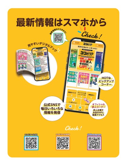 HOTなピックアップコーナー公式SNSで毎日いろいろな情報を発信オフィシャル求人コーナー求人企業やお店のHPに直接アクセスココどう?公式Xココどう?公式HP公式Instagramックすいデジタルブや見最新情報はスマホからから!はスマホ報情新最