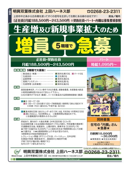 上田市中之条から古舟橋を渡ってすぐの信号を左折して右側にある緑の会社です!担当/堀内[正社員]月給188,500円〜243,500円※契約社員・パート・内職は募集要項参照生産増及び新規事業拡大のため☎0268-23-2311明興双葉株式会社上田ハーネス部上田市増員正社員・契約社員5職種で急募パート月給188,500円〜243,500円時給1,095円〜資格時間休日待遇普通自動車免許、パソコン操作できる方優遇、経験者優遇、未経験者大歓迎※教育訓練制度があるので安心して下さい。CADの操作ができる方(優遇)、ハーネス製造及び品質業務経験者(優遇)正契パ8:00〜17:008:00〜17:00の間で1日5〜7時間程度※勤務時間/日数など相談OKです※休憩:70分(昼50分/午前午後:各10分)正契パ基本週休2日制(会社カレンダーあり)GW、お盆、年末年始※年間休日120日週に4日以上、1日4時間以上☆勤務時間は相談OKです。☆扶養範囲内の勤務ももちろんOK!昇給あり、賞与あり※過去実績:24年2回支給(3.3ヶ月)社会保険完備※社会保険の特典あり(TDLの割引、予防接種の補助等)交通費規定支給、制服貸与、上履き貸与、食事手当(3,500円/月)★子育て支援手当(5,000円/1人※高校3年生で勤務時間に応じて計算)★介護手当※★は勤務時間により手当が変わります。1時間単位の有給休暇制度ありレクレーション開催(ボウリング大会、バーベキュー、忘年会等)社員紹介制度(報奨金あり)、面接前の工場見学可能子育て世代が働き易い職場です♪社内スポーツ部もあります♪同時募集在宅の「内職」さん★急募★月収例10,000円〜30,000円★業務委託★完全出来高制!お仕事の工程や工場見学など大歓迎です♪明興双葉株式会社上田ハーネス部上田市常磐城2381-32本社:東京都中央区京橋2-6-14日立第六ビル4Fhttps://www.meiko-futaba.co.jp/「ココどう?」を見ましたとお気軽にお電話下さい♪☎0268-23-2311担当/堀内パ正契契契契○製造組立・検査・・・・・・・・・・・・契約社員10名パート5名○生産技術・・・・・・・・・・・・・・・・正社員2名○品質管理・・・・・・・・・・・・・・・・契約社員2名○営業アシスタント・・・・・・・・・・・契約社員1名○生産管理(出荷業務)・・・・・・・・契約社員2名募集職種5職種で大募集!