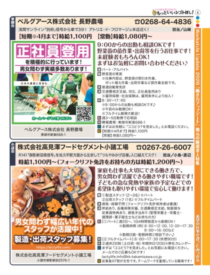 4●●●WorkstyleUpdate2026「働き方アップデート」地元の厳選求人特集株式会社高見澤フードセグメント小諸工場☎0267-26-6007R141「御影新田南信号」を佐久平駅方面から左折して「ツルヤみかげ店様」入口越えてスグ!時給1,100円〜(フォークリフト免許をお持ちの方は時給1,200円〜)家庭も仕事も大切にできる働き方で、男女問わず活躍できる働きやすい職場です!子どもの急な発熱や家族の予定などでの希望休も取りやすい環境で安心して働けます!担当/小島・渡辺希望の仕事がきっとみつかる①製造スタッフ(2〜3名)※パート②出荷スタッフ(1名)※フルタイムパート資格・経験不問(フォークリフト免許保持者は優遇)昇給あり、各種保険完備、交通費規定支給、制服貸与従業員特典あり、資格手当あり(管理栄養士・栄養士・調理師・菓子衛生士などお持ちの方)[①パート]週2日〜、1日4時間程度から勤務OK!※勤務時間(例)8:00〜12:00、13:00〜17:309:00〜16:00など※勤務日数・勤務時間ご相談下さい♪[②フルタイムパート]8:00〜17:30(休憩90分)②週休2日制(土日祝・他)年間休日120日※弊社カレンダーまずは「ココどう?を見ました」とお気軽にお電話ください。メールでのご応募もOKです!lactylife.info@kk-takamisawa.co.jp従業員の7割が女性です。チームワークを重視している職場です!男女問わず幅広い年代のスタッフが活躍中!製造・出荷スタッフ募集!https://lactylife.com/株式会社高見澤フードセグメント小諸工場小諸市御影新田2576-1ベルグアース株式会社長野農場浅間サンライン「別府」信号から車で3分!アトリエ・ド・フロマージュ本店近く!【短期※4月まで】時給1,100円【常勤】時給1,080円〜☎0268-64-4836担当/山﨑正社員登用を積極的に行っています!男女問わず実績多数あります!ホームページもご覧くださいベルグアース株式会社長野農場東御市新張688-19:00からの出勤も相談OKです!野菜苗の苗作業・出荷等を行うお仕事です!未経験者もちろんOK!まずはお気軽にお問い合わせください♪パート・アルバイト野菜苗の育苗※仕事内容は、野菜苗の間引き作業、ポット植え作業・出荷作業など苗作業全般です。普通自動車免許交通費規定支給、労災、正社員登用あり※雇用保険・社会保険は、雇用条件により加入!8:30〜17:00※9:00からの出勤も相談OKです♪※午前のみ勤務OK!※フルタイム勤務大歓迎!週3〜5日勤務で応相談横堰農場:東御市新張688-1まずはお気軽に「ココどう?を見ました」とお電話ください。【短期※4月まで】時給1,100円【常勤】時給1,080円〜東御市小諸市