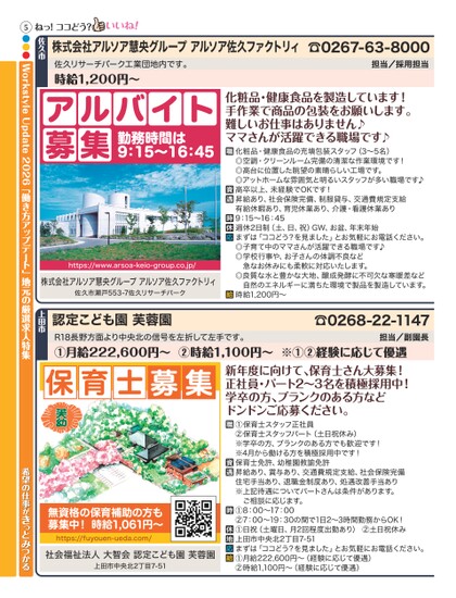 ☎0267-63-8000担当/採用担当株式会社アルソア慧央グループアルソア佐久ファクトリィ佐久リサーチパーク工業団地内です。時給1,200円〜佐久市ねっ!ココどう?アルバイト募集勤務時間は9:15〜16:45https://www.arsoa-keio-group.co.jp/株式会社アルソア慧央グループアルソア佐久ファクトリィ佐久市瀬戸553-7佐久リサーチパーク化粧品・健康食品を製造しています!手作業で商品の包装をお願いします。難しいお仕事はありません♪ママさんが活躍できる職場です♪化粧品・健康食品の充填包装スタッフ(3〜5名)◎空調・クリーンルーム完備の清潔な作業環境です!◎高台に位置した眺望の素晴らしい工場です。◎アットホームな雰囲気と明るいスタッフが多い職場です♪高卒以上、未経験でOKです!昇給あり、社会保険完備、制服貸与、交通費規定支給有給休暇あり、育児休業あり、介護・看護休業あり9:15〜16:45週休2日制(土、日、祝)GW、お盆、年末年始まずは「ココどう?を見ました」とお気軽にお電話ください。◎子育て中のママさんが活躍できる職場です♪◎学校行事や、お子さんの体調不良など急なお休みにも柔軟に対応いたします。◎良質な水と豊かな大地、醸成発酵に不可欠な寒暖差など自然のエネルギーに満ちた環境で製品を製造しています。時給1,200円〜R18長野方面より中央北の信号を左折して左手です。①月給222,600円〜②時給1,100円〜※①②経験に応じて優遇新年度に向けて、保育士さん大募集!正社員・パート2〜3名を積極採用中!学卒の方、ブランクのある方などドンドンご応募ください。保育士募集①保育士スタッフ正社員②保育士スタッフパート(土日祝休み)※学卒の方、ブランクのある方でも歓迎です!※4月から働ける方を積極採用中です!保育士免許、幼稚園教諭免許昇給あり、賞与あり、交通費規定支給、社会保険完備住宅手当あり、退職金制度あり、処遇改善手当あり※上記待遇についてパートさんは条件があります。ご相談に応じます。①8:00〜17:00②7:00〜19:30の間で1日2〜3時間勤務からOK!①日祝(土曜日、月2回程度出勤あり)②土日祝休み上田市中央北2丁目7-51まずは「ココどう?を見ました」とお気軽にお電話ください。①月給222,600円〜(経験に応じて優遇)②時給1,100円〜(経験に応じて優遇)無資格の保育補助の方も募集中!時給1,061円〜https://fuyouen-ueda.com/社会福祉法人大智会認定こども園芙蓉園上田市中央北2丁目7-51希望の仕事がきっとみつかる☎0268-22-1147担当/副園長認定こども園芙蓉園上田市5●●●WorkstyleUpdate2026「働き方アップデート」地元の厳選求人特集