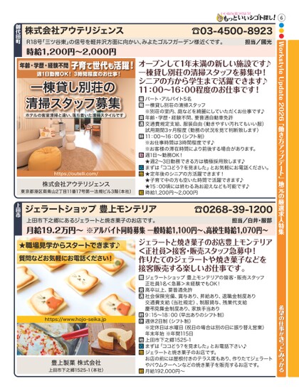 6●●●WorkstyleUpdate2026「働き方アップデート」地元の厳選求人特集☎03-4500-8923担当/國光株式会社アウテリジェンス御代田町年齢・学歴・経験不問子育て世代も活躍!週1日勤務OK!3時間程度のお仕事!一棟貸し別荘の清掃スタッフ募集ホテルの客室清掃と違い、落ち着いた清掃スタイルですhttps://outelli.com/株式会社アウテリジェンス東京都港区南青山2丁目11番17号第一法規ビル3階(本社)オープンして1年未満の新しい施設です♪一棟貸し別荘の清掃スタッフを募集中!シニアの方から学生まで活躍できます♪11:00〜16:00程度のお仕事です!パート・アルバイト5名一棟貸し別荘の清掃スタッフ※別荘の室内、庭などを綺麗にしていただくお仕事です♪年齢・学歴・経験不問、要普通自動車免許交通費規定支給、服装自由(動きやすい汚れてもいい服)試用期間3ヶ月程度(勤務の状況を見て判断致します)11:00〜16:00(シフト制)※お仕事時間は3時間程度です♪※お客様の滞在時間により前後する場合があります。週1日〜勤務OK!★週2〜3日勤務できる方は積極採用致します♪まずは「ココどう?を見ました」とお気軽にお電話ください。★定年後のシニアの方活躍できます!★子育て中の方も空いた時間で活躍できます♪★15:00頃には終わる為お迎えなども可能です♪時給1,200円〜2,000円上田市下之郷にあるジェラートと焼き菓子のお店です。月給19.2万円〜※アルバイト同時募集一般時給1,100円〜、高校生時給1,070円〜担当/白井・服部☎0268-39-1200ジェラートショップ豊上モンテリア上田市R18号「三ツ谷東」の信号を軽井沢方面に向かい、みよたゴルフガーデン様近くです。時給1,200円〜2,000円希望の仕事がきっとみつかるジェラートショップ豊上モンテリアの接客・販売スタッフ正社員1名<急募>未経験でもOK!高卒以上、要普通免許社会保険完備、賞与あり、昇給あり、退職金制度あり交通費支給(当社規定)、制服貸与、残業代支給慶弔見舞金制度あり、家族手当あり9:15〜18:00(早出ありのシフト制)週休2日制(シフト制)※定休日は水曜日(祝日の場合は別の日に振り替え営業)年末年始※年間115日上田市下之郷1525-1まずは「ココどう?を見ました」とお電話下さい♪ジェラートと焼き菓子のお店です。お店の前には屋根付きのテラス席もあり、作りたてジェラートやバウムクーヘンなどの焼き菓子を販売するお店です。月給192,000円〜ジェラートと焼き菓子のお店豊上モンテリア<正社員>接客・販売スタッフ急募中!作りたてのジェラートや焼き菓子などを接客販売する楽しいお仕事です。★職場見学からスタートできます♪質問などお気軽にお電話ください!https://www.hojo-seika.jp豊上製菓株式会社上田市下之郷1525-1(本社)