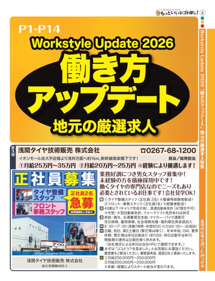 8●●●WorkstyleUpdate2026「働き方アップデート」地元の厳選求人特集P1-P14WorkstyleUpdate2026働き方アップデート地元の厳選求人担当/採用担当イオンモール佐久平店様より浅科方面へ約1km、新幹線高架橋下です!①月給25万円〜35万円②月給20万円〜25万円※経験により優遇します!☎0267-68-1200浅間タイヤ技術販売株式会社佐久市希望の仕事がきっとみつかる①タイヤ整備スタッフ(正社員2名)※整備等経験者歓迎!②フロント・事務スタッフ(正社員1名)※経験者歓迎!45歳以下(キャリア形成の為)、普通自動車免許(AT限定不可)※中型・大型自動車免許、フォークリフト免許あれば尚可昇給・賞与、交通費規定支給、マイカー・バイク通勤可労災保険、雇用保険、社会保険完備・福利厚生倶楽部加入8:30〜17:00(実働7時間・休憩90分)※②は9:00〜(応相談)日曜、祝日、第2土曜日(繁忙期は除く)、年末年始、GW、夏季休暇、繁忙期は休日出勤あり(約10日・休日出勤手当有り)閑散期の連休は比較的長く休めます。(会社規定による休日は当社HPにて確認できます。)まずは「ココどう?を見ました」とお気軽にお電話ください。履歴書をご郵送ください。書類選考後、面接日をご連絡いたします。①月給250,000円〜350,000円②月給200,000円〜250,000円※年齢・経験によりスタート給与が変わります。業務好調につき男女スタッフ募集中!未経験の方を積極採用中です!働くタイヤの専門店なのでニーズもあり必要とされているお仕事です!会社見学OK!正社員タイヤ整備スタッフフロント事務スタッフ募集急募正社員2名試用期間6ヶ月あり経験者相談に応じます!https://asama-tire.com浅間タイヤ技術販売株式会社佐久市塚原465-1