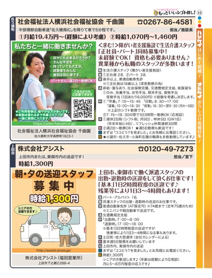 16●●●はじめて掲載お久しぶり掲載特集!社会福祉法人横浜社会福祉協会千曲園☎0267-86-4581中部横断自動車道「佐久穂南IC」を降りて車で5分程です。①月給19.4万円〜(経験により考慮)②時給1,070円〜1,460円担当/施設長佐久穂町<求む!>障がい者支援施設で生活介護スタッフ「正社員・パート」同時募集中!未経験でOK!資格も必要ありません♪異業種から転職のスタッフが多数います!生活介護スタッフ(障がい者支援施設)①正社員2名②パート3名高卒以上、普通自動車免許※①正社員は18歳以上(深夜勤務の為)昇給・賞与あり、社会保険完備、交通費規定支給、制服貸与①のみ、扶養手当、住宅手当、期末手当、資格手当夜勤手当(1回あたり6,000円)※経験を考慮し決定します。①「早番」7:15〜15:45「日勤」8:30〜17:00「遅番」10:00〜18:30「夜勤」16:30〜翌9:30(月4〜5回)※上記のシフト勤務です。②7:15〜18:30の間で1日3時間〜勤務OK(応相談)①週休2日制(シフト制、月9日)、特休5日(GW1日)(年末年始に4日)、リフレッシュ休暇連続3日間②週2日〜勤務OK!★週5日勤務も歓迎です!まずは「ココどう?を見ました」とお気軽にお電話ください。★小諸市・佐久市・小海町在籍の職員も多数勤務しています♪私たちと一緒に働きませんか?自分にも出来るだろうか?そんな不安を持っていても大丈夫。経験者もみんな最初は初心者です。パートさん!週2日〜勤務OK!こちらからもご応募できます★ご利用者様は、穏やかな方が多いです。★夜勤は慣れるまで先輩スタッフが一緒に業務に入ります♪https://yoko-fukushi.or.jp/社会福祉法人横浜社会福祉協会千曲園佐久穂町大字高野町1623-1株式会社アシスト上田市内または、東御市内の送迎です!時給1,300円上田市!☎0120-49-7273担当/宮下朝・夕の送迎スタッフ募集中時給1,300円シニアの方活躍できます♪http://assist-jinzai.jp/株式会社アシスト(塩田営業所)上田市下之郷乙288-4上田市、東御市で働く派遣スタッフの出勤・退勤時の送迎をして頂くお仕事です!「基本」1日2時間程度の送迎です♪残業等により1日3〜4時間もあります!パート・アルバイト1名派遣スタッフの出勤・退勤時の送迎のお仕事です。普通自動車免許(AT限定可)※74歳まで(定年75歳のため)※ミニバンや軽自動車で送迎です。交通費規定支給「出勤時」7:00〜8:00「退勤時」17:00〜18:00※基本1日2時間程度の送迎ですが残業等により1日3〜4時間になる事もあります。土日祝・他大型連休(会社カレンダーによる)基本週5日勤務をお願いしています上田市内、東御市内の送迎まずは「ココどう?を見ました」とお気軽にお電話ください。時給1,300円シニアの方歓迎します♪(年齢は経験により応相談)月に5〜8万円程度の収入です♪
