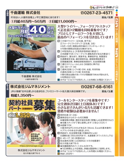 18●●●はじめて掲載!お久しぶり掲載特集!大型ドライバー、フォークリフトスタッフ<正社員>2職種を同時募集中です♪プロとしてチームワークを大切にし最高のパフォーマンスを引き出しています!①大型ドライバー(正社員、若干名)②フォークリフトスタッフ(正社員、3名)※5月〜10月(青果出荷作業のリフトオペレーター)※冬期の期間は別途お仕事あります。①中型免許以上(大型免許取得者大歓迎!)②未経験でOK(フォークリフト運転免許がある方歓迎!)昇給あり、賞与あり、家族手当、無事故手当、制服貸与交通費規定支給、確定居室年金、資格取得制度あり定期健康診断、無事故表彰制度あり、社会保険完備①運行スケジュールによる(36協定に準ずる)②8:00〜17:00①週休2日制(シフト制)GW、お盆、年末年始②週休2日制(シフト制)年末年始※繁忙期は出勤が多いですが閑散期で休みが取れます。※年間休日112日まずは「ココどう?を見ました」とお気軽にお電話ください!コールセンタースタッフを募集中です♪完全週休2日制(土日祝休み)です!小さなお子さんがいる方も活躍できます!資格や経験は必要ありません!契約社員(2〜3名)損保会社からのコール代行業務各種保険の異動・解約手続き処理(受電による変更受付など)★先輩スタッフが丁寧に説明します!ご安心ください!未経験でOK※基本的なPCスキルがある方(Word、Excelの基本操作)※ブランクのある方も歓迎します。昇給あり、社会保険完備(労働条件による)交通費支給(月50,000円まで)、私服勤務(オフィスカジュアル)8:45〜17:30(休憩60分)完全週休2日制(土日祝休み)※その他暦通り佐久市猿久保776-5★扶養範囲内のパートさんもOKです。★1日3時間以上で応相談。詳細は面接時にご説明します。まずは「ココどう?を見ました」とお気軽にお電話ください。時給1,350円〜☎0267-23-4571担当/北澤R18沿い、小諸市加増上ノ平工業団地にあります!①月給40万円〜50万円②日給11,000円〜千曲運輸株式会社小諸市大型ドライバー月給万円以上フォークリフトスタッフ日給11,000円以上40☎0267-68-6161担当/土屋JR小海線「北中込駅」から徒歩5分、ファミリーマート佐久猿久保店様隣です。時給1,350円〜株式会社ジムマネジメント佐久市https://chikuma-tr.jp/千曲運輸株式会社小諸市加増578契約社員募集パート(扶養範囲内)時給1,350円〜お子さんの急な発熱お休みなども対応します♪https://jimmanage.co.jp/株式会社ジムマネジメント佐久市猿久保776-5