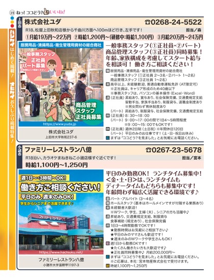 厨房用品・清掃用品・衛生管理用資材の総合商社担当/森R18、松屋上田秋和店様から千曲川方面へ100mほど行き、左手です!①月給19万円〜22万円②時給1,200円〜(研修中:時給1,100円)③月給20万円〜24万円一般事務スタッフ(①正社員・②パート)商品管理スタッフ(③正社員)同時募集!年齢、家族構成を考慮してスタート給与を相談可!働き方ご相談ください!一般事務スタッフ正社員パート募集お時間などご相談ください☎0268-24-5522株式会社ユダ上田市ねっ!ココどう?19●●●はじめて掲載!お久しぶり掲載特集!厨房用品・清掃用品・衛生管理用資材の総合商社一般事務スタッフ(①正社員2〜3名・②パート1〜2名)商品管理スタッフ(③正社員1〜2名)高卒以上、未経験歓迎、普通自動車運転免許(AT限定可)※正社員は、キャリア形成のため40歳以下※事務スタッフは、パソコンの基本操作(ExcelWord)(正社員)昇給あり、賞与あり、社会保険完備、交通費規定支給皆勤手当、家族手当あり、制服貸与、退職金制度あり※男女問わず育休制度あり(パート)昇給あり、制服貸与、社会保険完備、交通費規定支給(正社員)8:30〜18:00(パート)9:00〜17:00の間で1日4〜5時間程度※9:00〜15:00でもOKです!(正社員)週休2日制(土日祝)※年間休日120日(パート)平日のみのお仕事です!(土・日・祝日お休み)まずは「ココどう?を見ました」とお気軽にお電話ください。商品管理スタッフ正社員募集https://www.yuda.jp株式会社ユダ上田市大字秋和237-6☎0267-23-5678担当/宮本ファミリーレストラン八億R18沿い、カラオケまねきねこ小諸店様すぐ近くです!時給1,100円〜1,250円小諸市週1日〜・3時間〜OK!働き方ご相談ください!平日のみ、週末のみOK!学生からシニアまで活躍できます♪https://www.hachioku.net/ファミリーレストラン八億小諸市大字滋野甲1197-3平日のみ勤務OK!ランチタイム募集中!<金・土・日>は、ランチタイムもディナータイムもどちらも募集中です!年齢問わず幅広く活躍できる環境です♪パート・アルバイト(3〜4名)ホールスタッフ(基本はホールメインですが付随する業務あり)未経験者大歓迎!※Wワーク、学生、主婦(夫)、シニアの方も活躍中♪昇給あり、交通費規定支給、制服貸与食事補助(規定あり)、社会保険完備1日3〜4時間勤務でOKです!★勤務時間はお気軽にご相談下さい♪★平日のみのママさんも歓迎です!★週末のみのWワークや学生さんもOK!週1日から勤務OKです!★たくさん働きたい方も大歓迎です♪★正社員同時募集中♪月給200,000円〜まずは「ココどう?を見ました」とお気軽にお電話ください。※ご応募は、本社:宮本物産株式会社で受付けます。時給1,100円〜1,250円