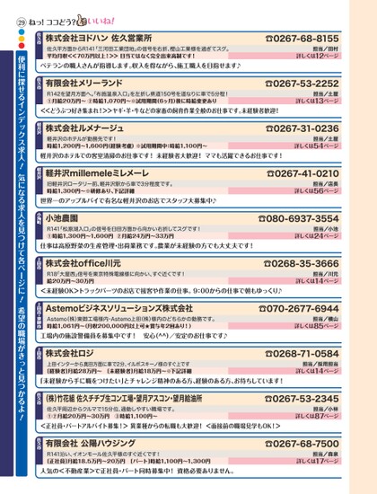 ☎0267-68-8155担当/田村詳しくは12ページ☎0267-53-2252担当/土屋詳しくは13ページベテランの職人さんが指導します。収入を得ながら、施工職人を目指せます♪株式会社ヨドハン佐久営業所佐久平方面からR141「三河田工業団地」の信号を右折、樫山工業様を過ぎてスグ。平均月収<<70万円以上!>>日当ではなく完全出来高制です!佐久市有限会社メリーランドR142を望月方面へ。布施温泉入口」を左折し県道150号を道なりに車で5分程!①月給20万円〜②時給1,070円〜※試用期間(6ヶ月)後に時給変更あり佐久市<<どうぶつ好き集まれ!>>ヤギ・羊・牛などの家畜の飼育作業全般のお仕事です。未経験者歓迎!☎0267-31-0236担当/土屋詳しくは54ページ株式会社ルメナージュ軽井沢のホテルが勤務先です!時給1,200円〜1,600円(経験考慮)※試用期間中:時給1,100円〜軽井沢軽井沢のホテルでの客室清掃のお仕事です!未経験者大歓迎!ママも活躍できるお仕事です!☎0267-41-0210担当/店長詳しくは56ページ☎080-6937-3554担当/小池詳しくは24ページ☎0268-35-3666担当/川元詳しくは14ページ仕事は高原野菜の生産管理・出荷業務です。農業が未経験の方でも大丈夫です!世界一のアップルパイで有名な軽井沢のお店でスタッフ大募集中♪軽井沢millemeleミレメーレ旧軽井沢ロータリー前、軽井沢駅から車で3分程度です。時給1,300円〜※研修あり、下記詳細軽井沢小池農園R141「松原湖入口」の信号を臼田方面から向かい右折してスグです!①時給1,300円〜1,600円②月給24万円〜33万円小海町株式会社office川元R18「大屋西」信号を東京特殊電線様に向かい、すぐ近くです!給20万円〜30万円上田市☎070-2677-6944担当/横山詳しくは85ページ☎0268-71-0584担当/採用担当詳しくは14ページ工場内の施設警備員を募集中です!安心(^^)/安定のお仕事です♪Astemoビジネスソリューションズ株式会社Astemo(株)東御工場様内・Astemo上田(株)様内のどちらかの勤務です。時給1,061円〜(月収200,000円以上可★賞与年2回あり!)上田市・東御市株式会社ロジ上田インターから真田方面に車で2分、イルボスキーノ様のすぐ上です[経験者]月給28万円〜[未経験者]月給18万円〜※下記詳細上田市「未経験から手に職をつけたい」とチャレンジ精神のある方、経験のある方、お待ちしています!<未経験OK>トラックパーツのお店で接客や作業の仕事。9:00からの仕事で朝もゆっくり♪ねっ!ココどう?☎0267-53-2345担当/小林詳しくは87ページ(株)竹花組佐久チチブ生コン工場・望月アスコン・望月給油所佐久市佐久平周辺からクルマで15分位、通勤しやすい職場です。①②月給20万円〜30万円③時給1,100円〜<正社員・パートアルバイト募集!>異業種からの転職も大歓迎!<面接前の職場見学もOK!>29●●●便利に探せるインデックス求人!気になる求人を見つけて各ページに!希望の職場がきっと見つかるよ!☎0267-68-7500担当/森泉詳しくは17ページ人気の<不動産業>で正社員・パート同時募集中!資格必要ありません。R141沿い、イオンモール佐久平様のすぐ近くです![正社員]月給18.5万円〜20万円[パート]時給1,100円〜1,300円有限会社公陽ハウジング佐久市