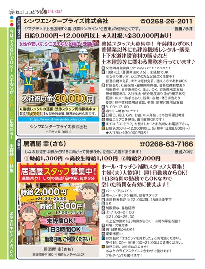 シンワエンタープライズ株式会社☎0268-26-2011ヤマダデンキ上田店様すぐ裏、浅間サンライン「住吉東」の信号近くです。日給9,000円〜12,000円以上★入社祝い金30,000円あり!担当/永井女性や若い方、シニアの方など幅広く活躍中!入社祝い金30,000円★建機レンタルの運搬・洗浄スタッフ同時募集中★【】大型免許必須、勤務地は佐久市です。1,500円時給https://www.shinwaenterprise.com/シンワエンタープライズ株式会社上田市古里1989-2警備スタッフ大募集中!年齢問わずOK!警備業以外にも建設機械レンタル・販売上下水道建設資材の販売など土木建設等に関わる業務を行っています♪交通誘導警備員(5〜8名)パート・アルバイト18歳以上(警備業法による)、未経験でOK※女性や若い方、シニアの方など幅広く活躍中!普通自動車免許、または原付免許、通える方であればOK昇給あり、社会保険・雇用保険完備、資格取得制度あり制服貸与、直行直帰OK、日払いOK、交通費規定支給研修期間あり、入社祝金・紹介制度あり(社内規定あり)夏期・年末一時手当あり、残業・夜勤・休日手当あり夏期:熱中症対策用品支給、冬期:防寒対策用品支給8:00〜17:00週2日〜勤務OKです!日曜日、祝日、GW、お盆、年末年始、その他希望日考慮東信エリアの各現場、直行直帰OKです!まずは「ココどう?」を見ました!とお気軽にお電話下さい。日給9,000円〜12,000円以上(研修中:日給8,800円〜)★入社祝い金30,000円あり!ねっ!ココどう?上田市・佐久市☎0268-63-7166担当/中村居酒屋幸(さち)東御市しなの鉄道田中駅からR18に向かって徒歩3分。左側にお店があります!①時給1,300円※高校生時給1,100円②時給2,000円居酒屋募集中!スタッフ通勤楽々!しなの鉄道「田中駅」徒歩3分2,000円時給21:00〜25:001,300円時給17:00〜21:00未経験OK!1日3時間OK!勤務日時、ご相談ください!居酒屋幸(さち)東御市田中160-4稲荷センタービル2Fホール・キッチン補助スタッフ大募集!主婦(夫)大歓迎!週1日勤務からOK!1日3時間の勤務でもOKなので空いた時間を有効に使えます!パート・アルバイトホール・キッチン補助、接客スタッフ未経験者歓迎※22:00以降、18歳未満不可5名制服貸与、昇給随時①17:00〜21:00②21:00〜25:00※上記の間で1日3時間からOK!※時間帯応相談!月曜・火曜定休週1日勤務からOK!東御市田中お気軽に「ココどう?を見ました」とお電話ください。受付16:00〜※18:00〜21:00はご遠慮ください。勤務日時、ご相談に応じます!あなたのライフスタイルに合わせて働けます!フルタイムでも働けます!39●●●今は、できないでOK!<不安>が<よかった>に変わる!未経験応援特集希望の仕事がきっとみつかる